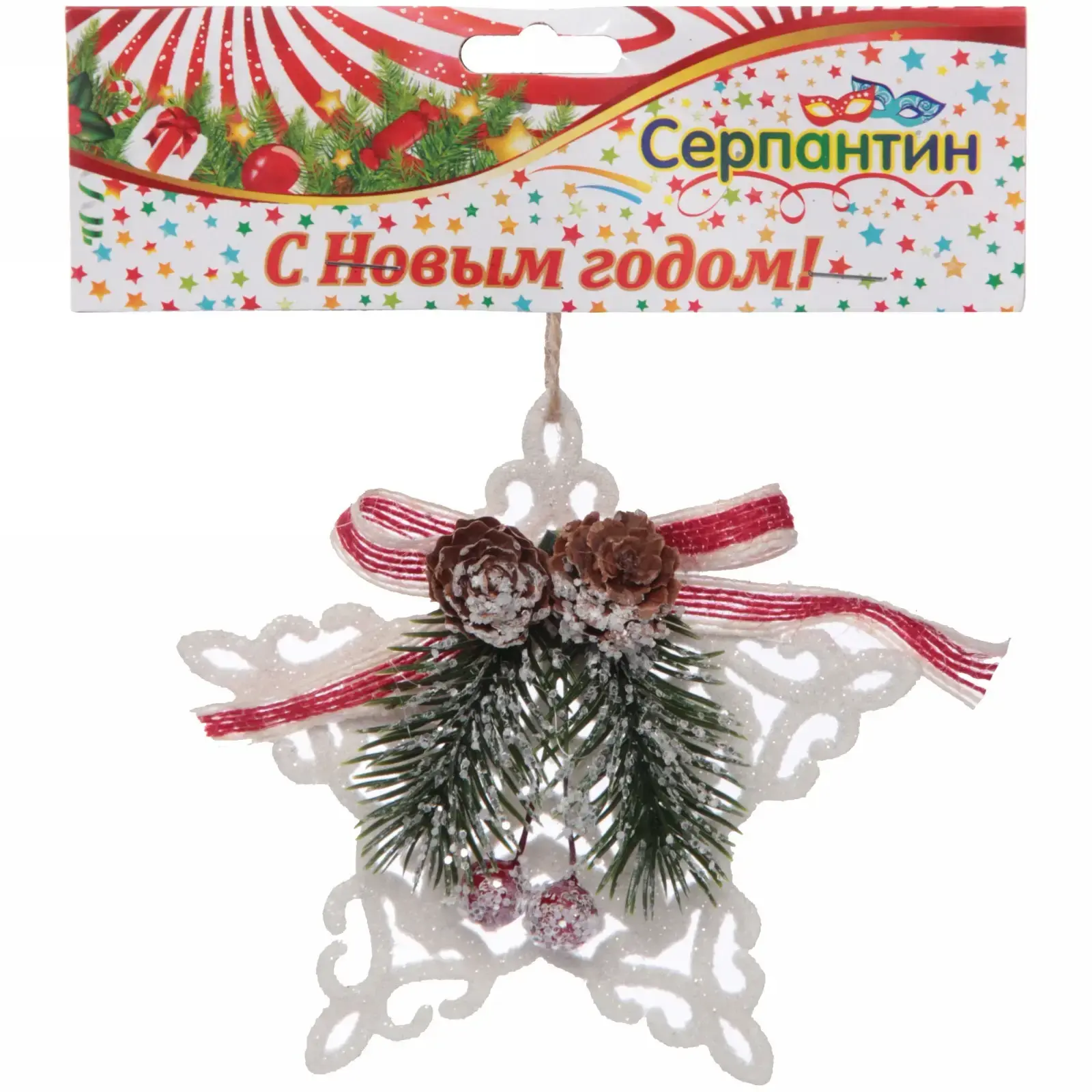 Размер подвески составляет 11 см, что делает ее компактной и удобной для использования. Белый цвет с блестящей фактурой и резными элементами придает ей праздничный вид. Декор из искусственной ели и красной ленты добавляет яркости и контраста, делая подвеску настоящим украшением вашего праздника.
