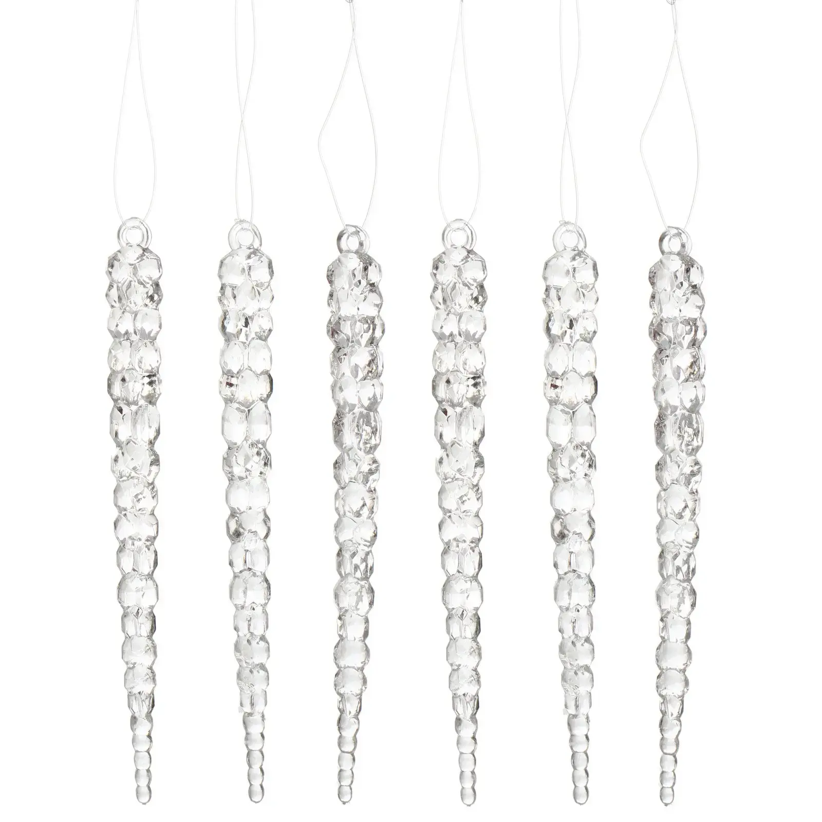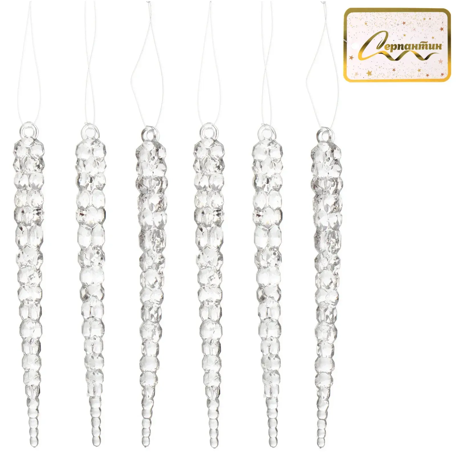 Размер каждого элемента — около 15 см, форма имитирует ледяные сосульки с сегментированной поверхностью. Товары из этого набора помогут легко и просто создать праздничное украшение, которое подчеркнет зимнюю тему и создаст уютную атмосферу в доме или офисе.