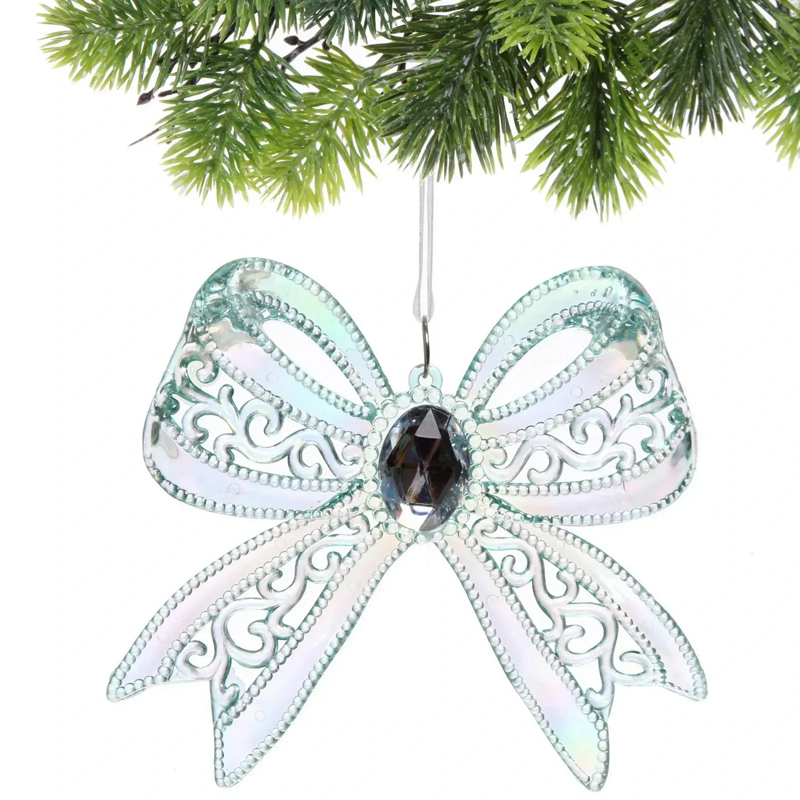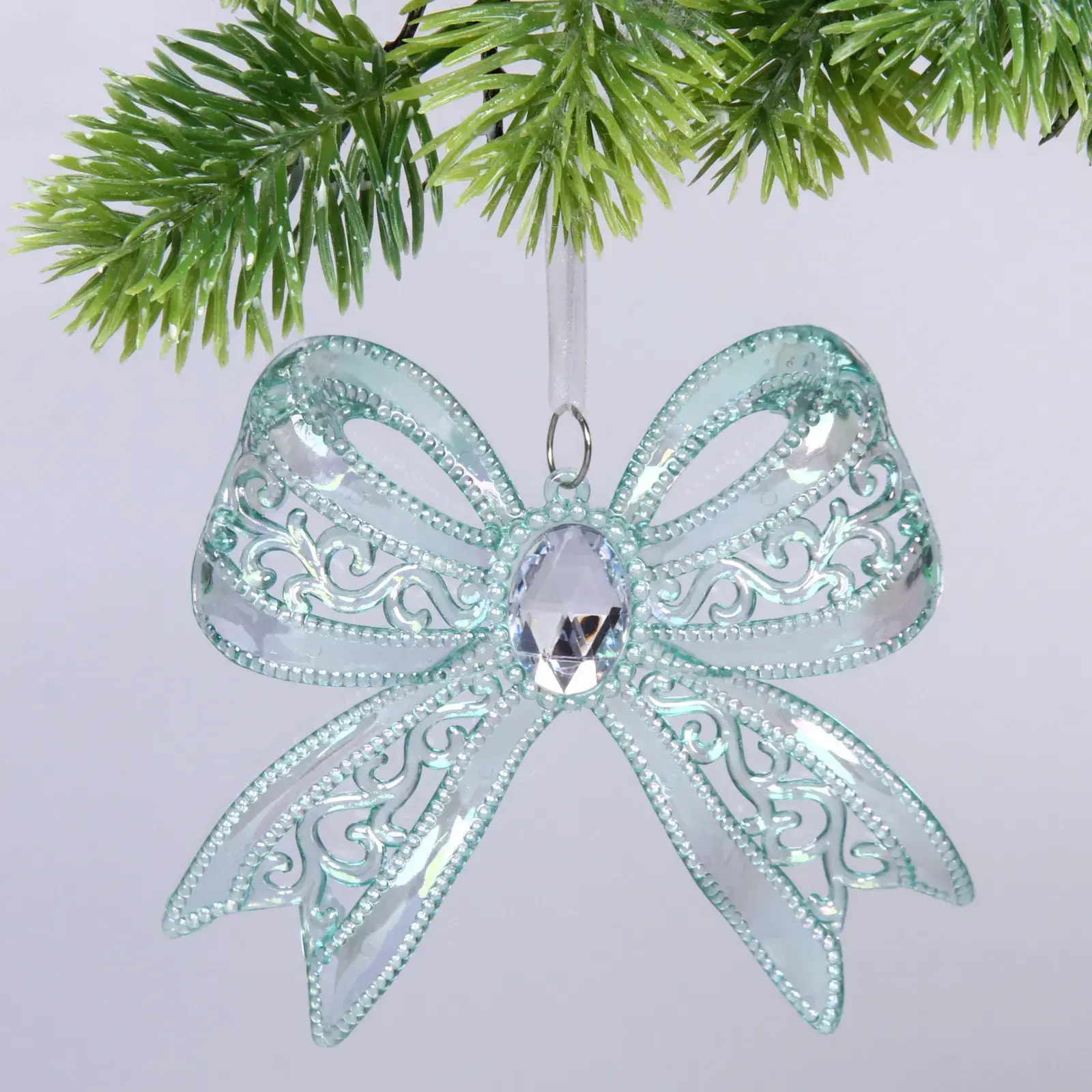 Изготовленная из качественного пластика, подвеска имеет размеры 13х11 см и прозрачный зелёный оттенок, который прекрасно сочетается с другими элементами декора. Центральная часть банта украшена черным кристаллом, что придаёт ему дополнительный шарм и блеск. Удобная петелька для подвешивания позволяет легко разместить изделие в любом месте — на ёлке, стене или в качестве украшения стола.