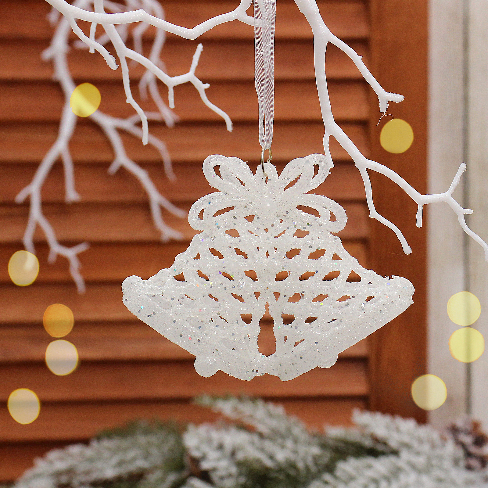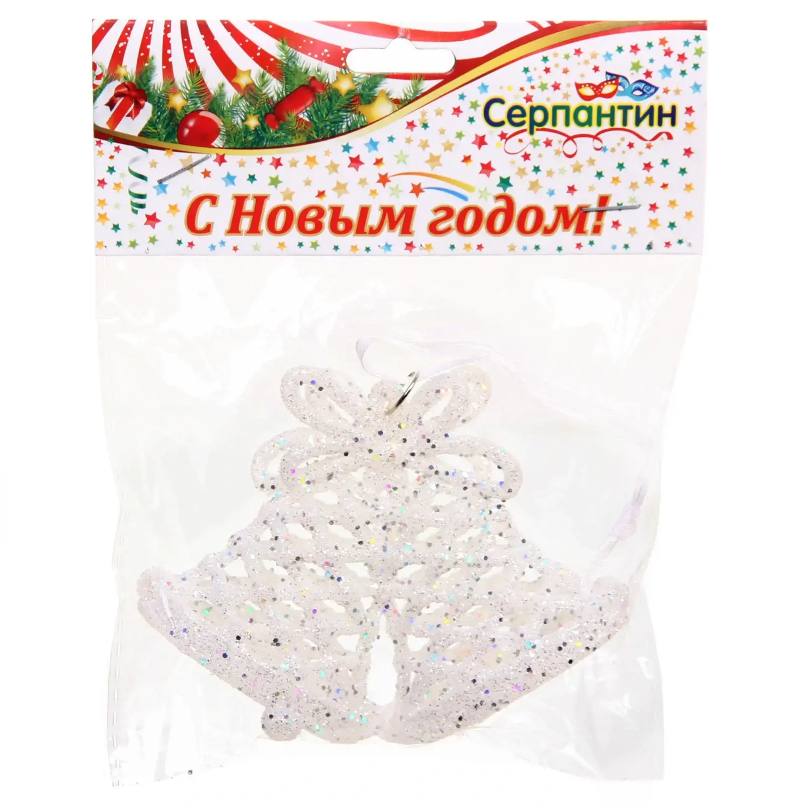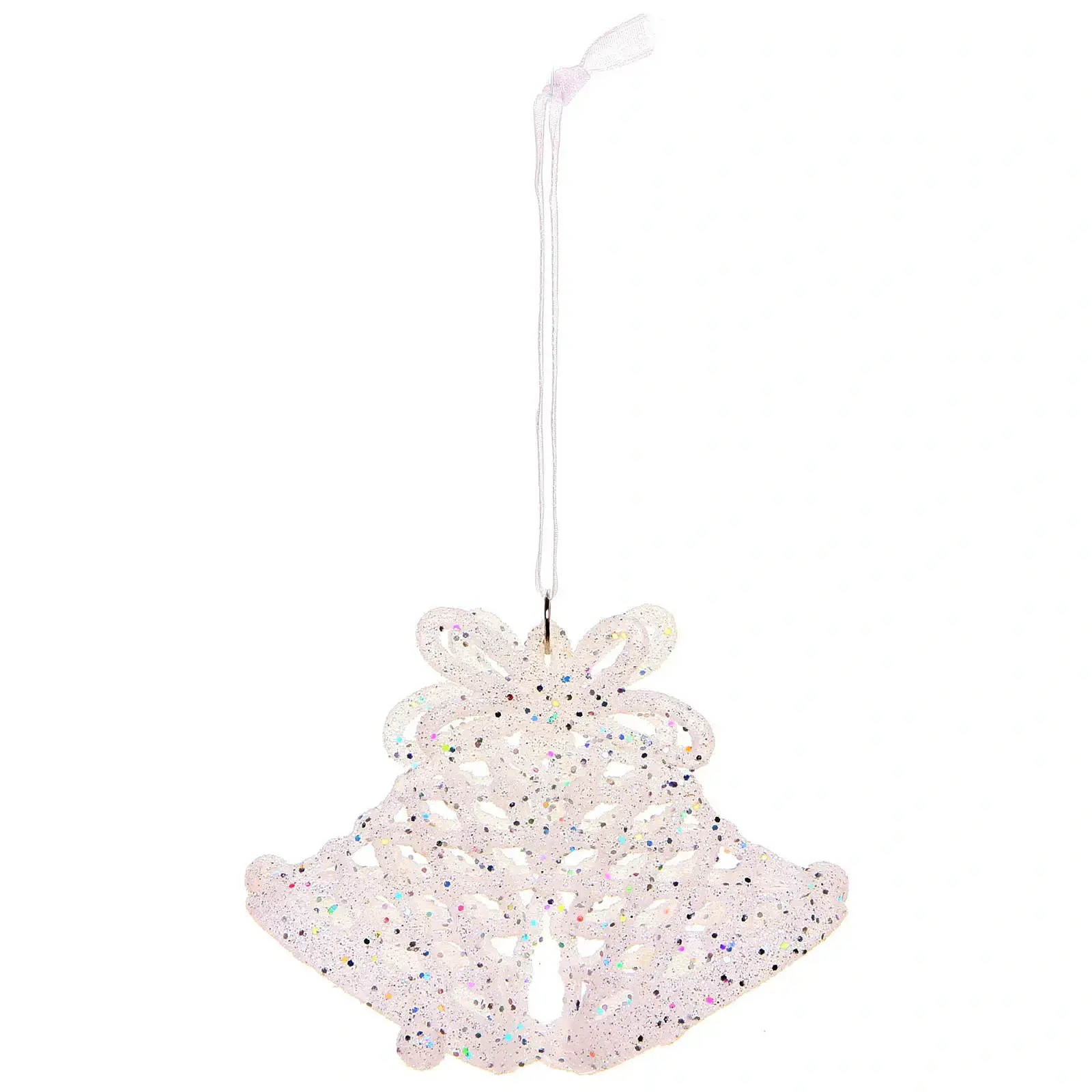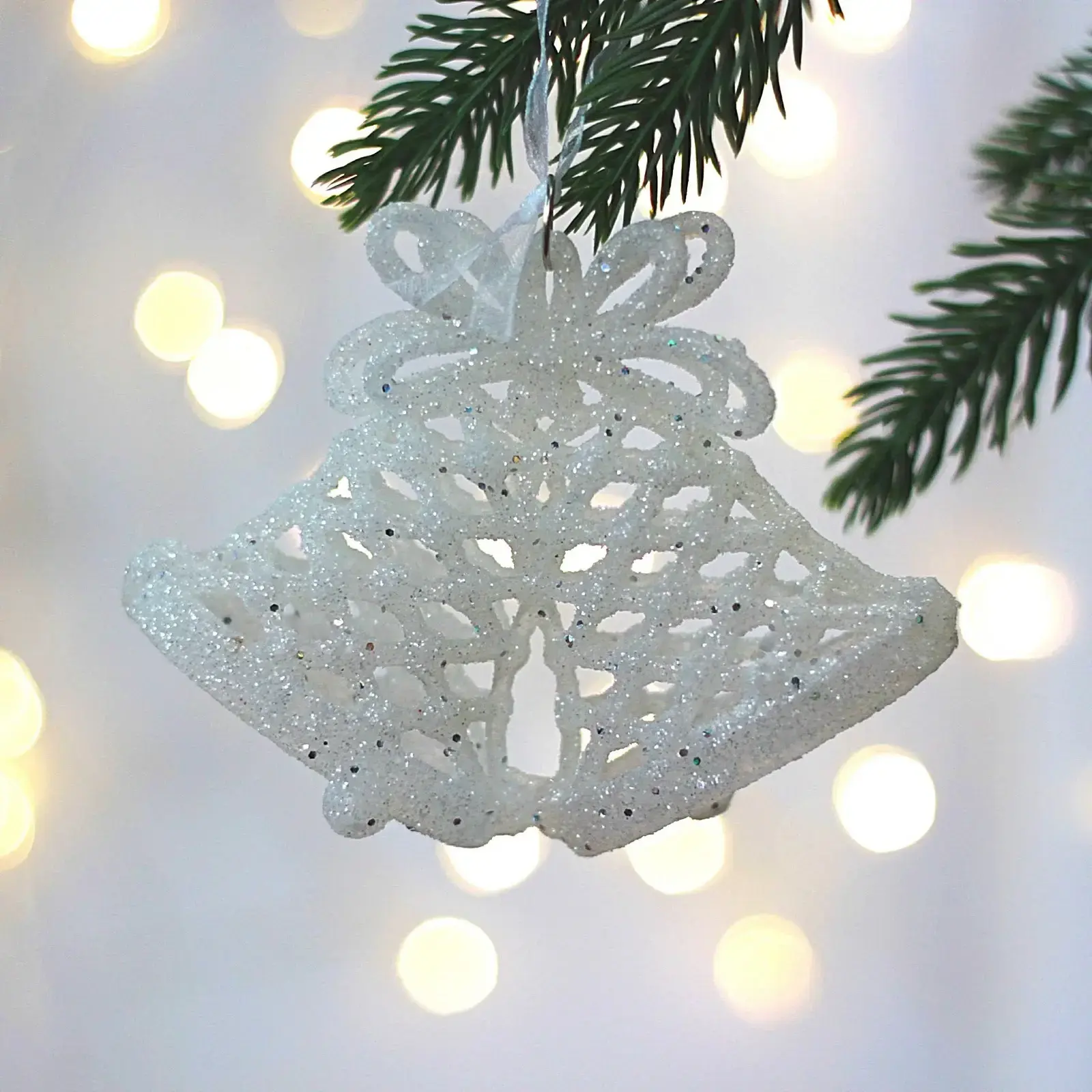 Эта изящная подвеска станет идеальным украшением для вашего дома в новогодние праздники. С белым блеском и ажурным дизайном, колокольчики добавят нотку волшебства и уюта в любое пространство. Подвеска выполнена из легкого пластика, что делает её удобной для использования и долговечной. Благодаря прозрачной ленте, вы сможете легко повесить её на ёлку, двери или стены, создавая уникальные праздничные композиции.