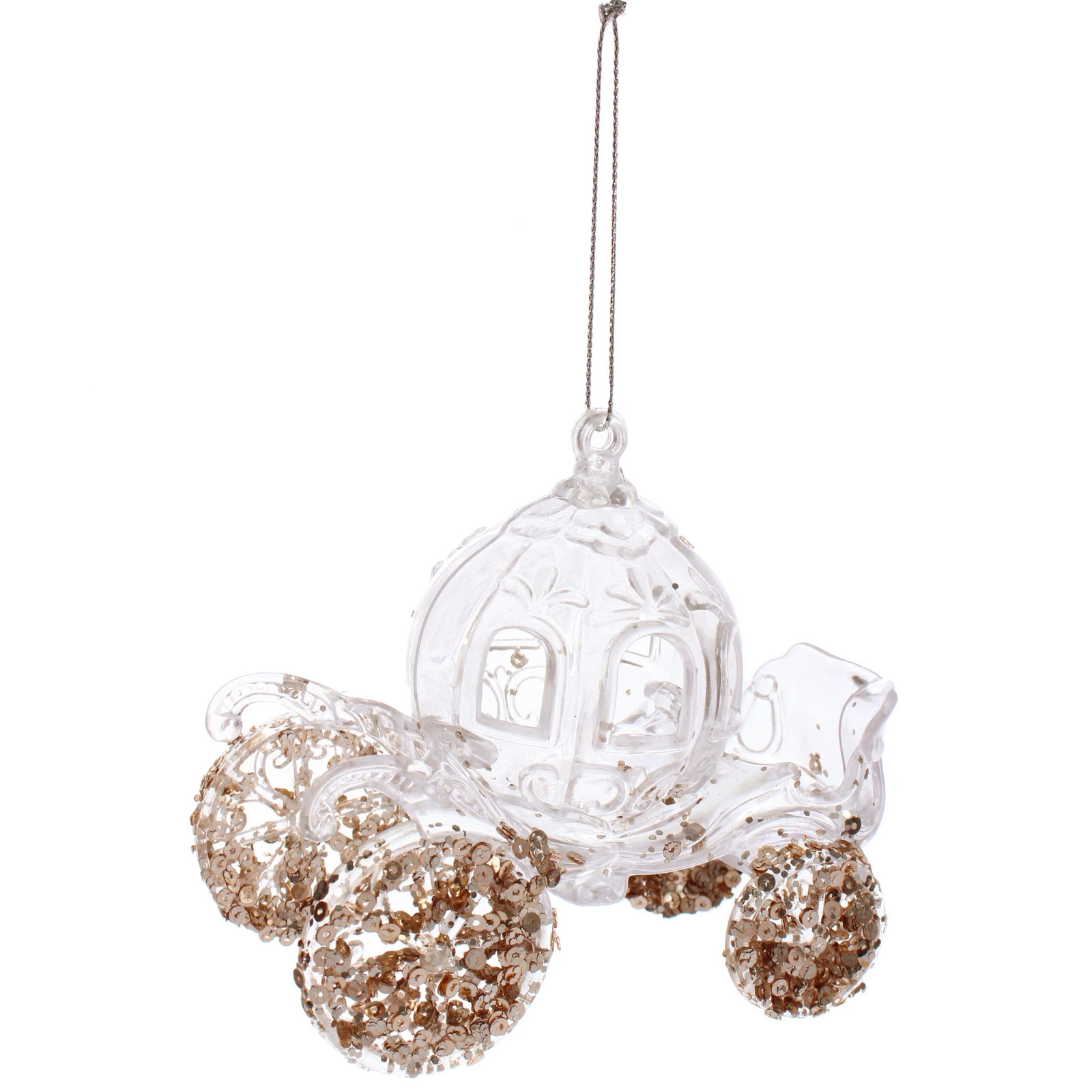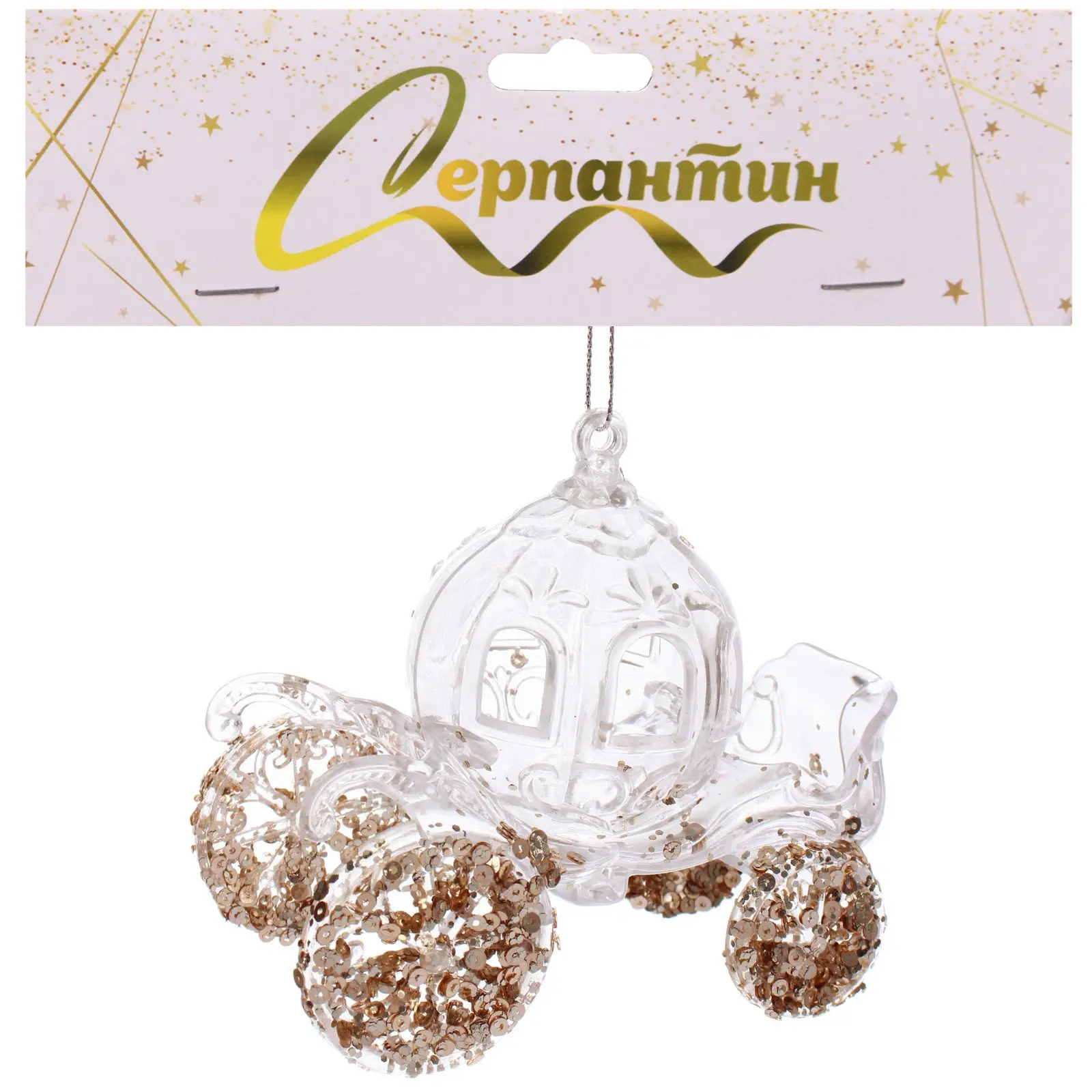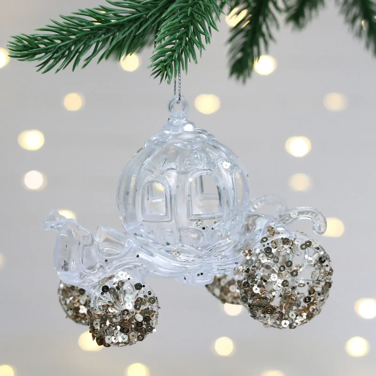 Подвеска 'Королевская карета' станет изысканным украшением вашего праздничного интерьера. Благодаря элегантному сочетанию прозрачного акрила и золотых блёсток, она создаст неповторимую атмосферу волшебства.