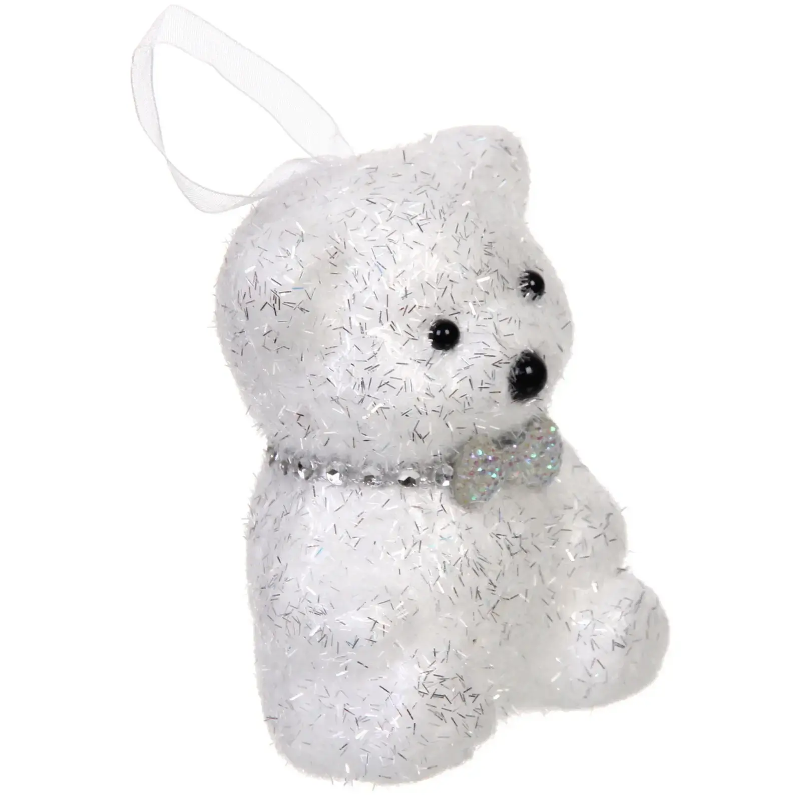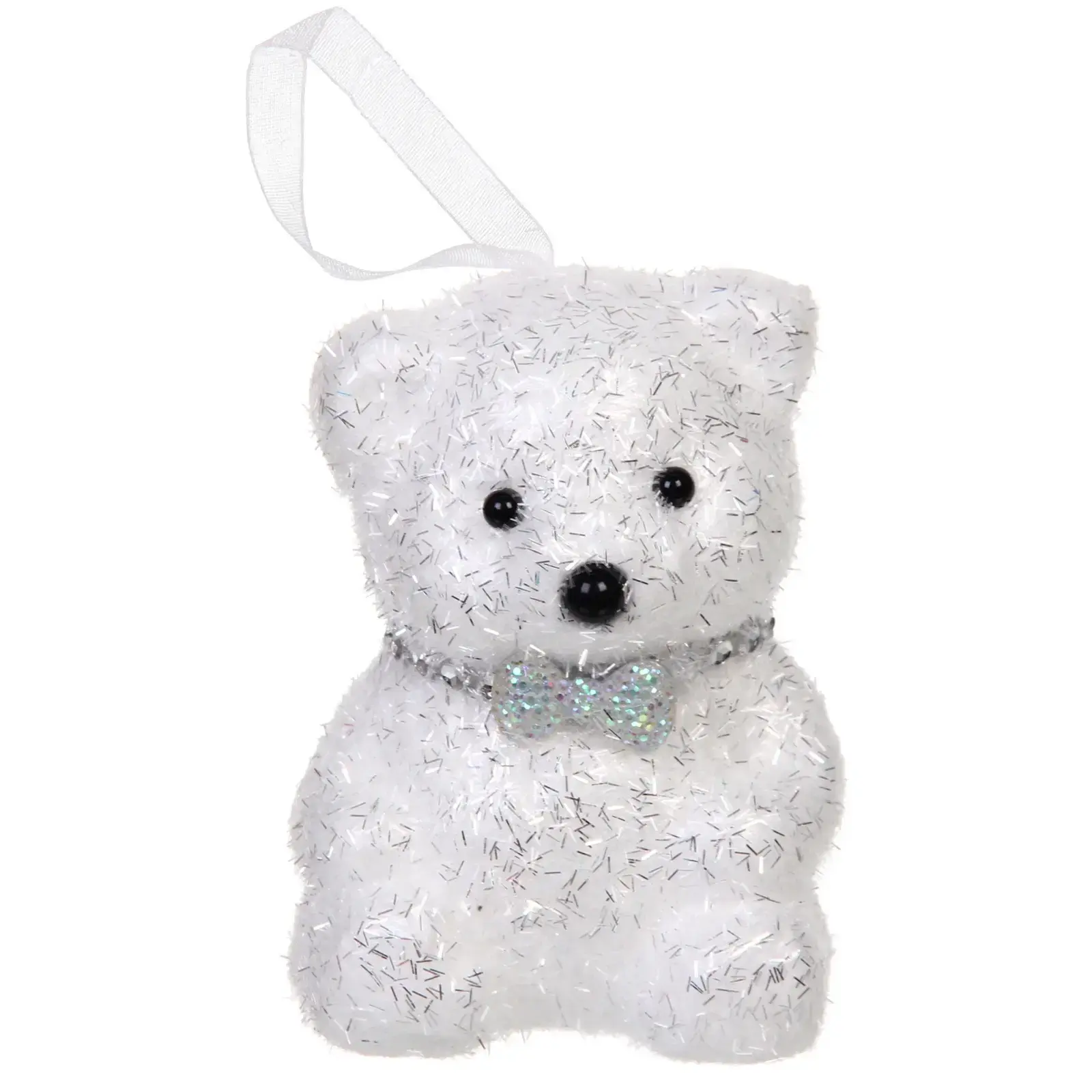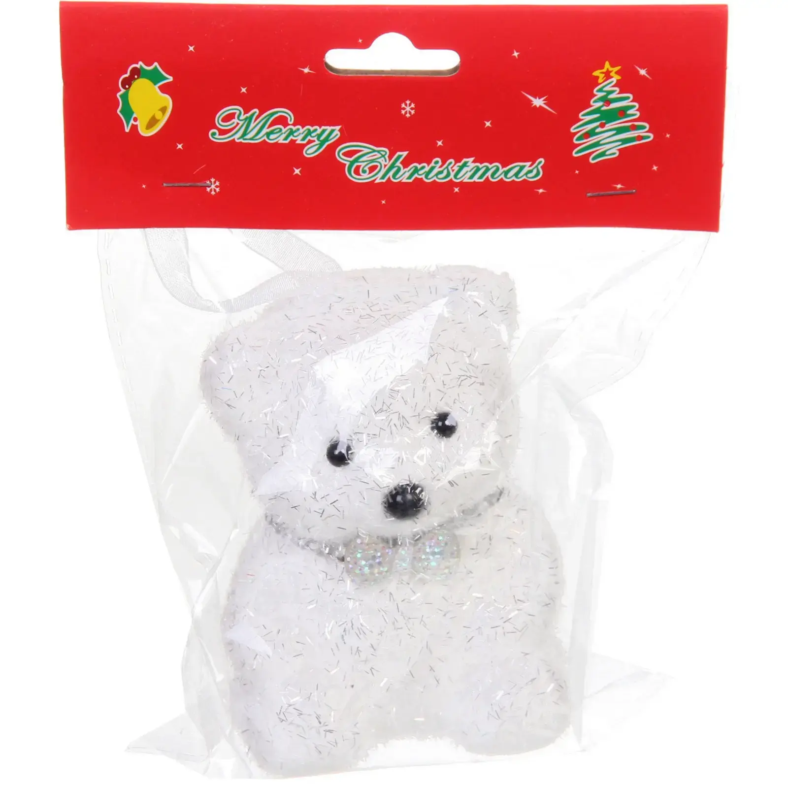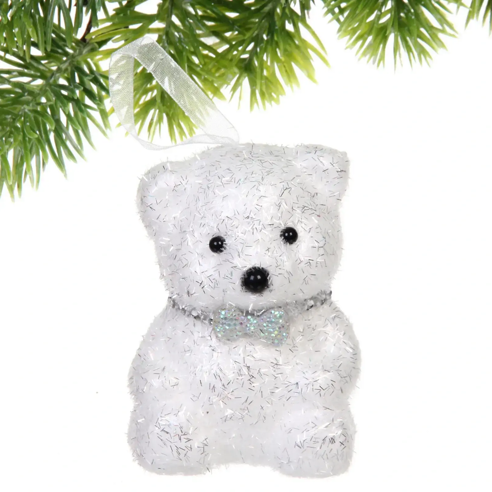 Подвеска выполнена в белом цвете и украшена черными пластиковыми глазками и носом, что придает ей милый и дружелюбный вид. Размеры медвежонка не указаны, но он выглядит небольшим и легким, что делает его идеальным для использования в качестве новогоднего декора. Не упустите возможность добавить этот очаровательный элемент в вашу коллекцию праздничных украшений!
