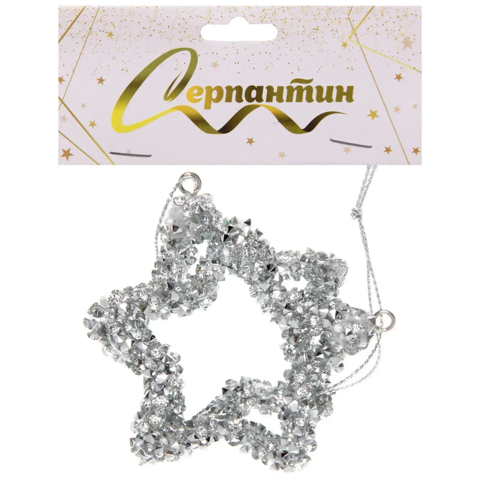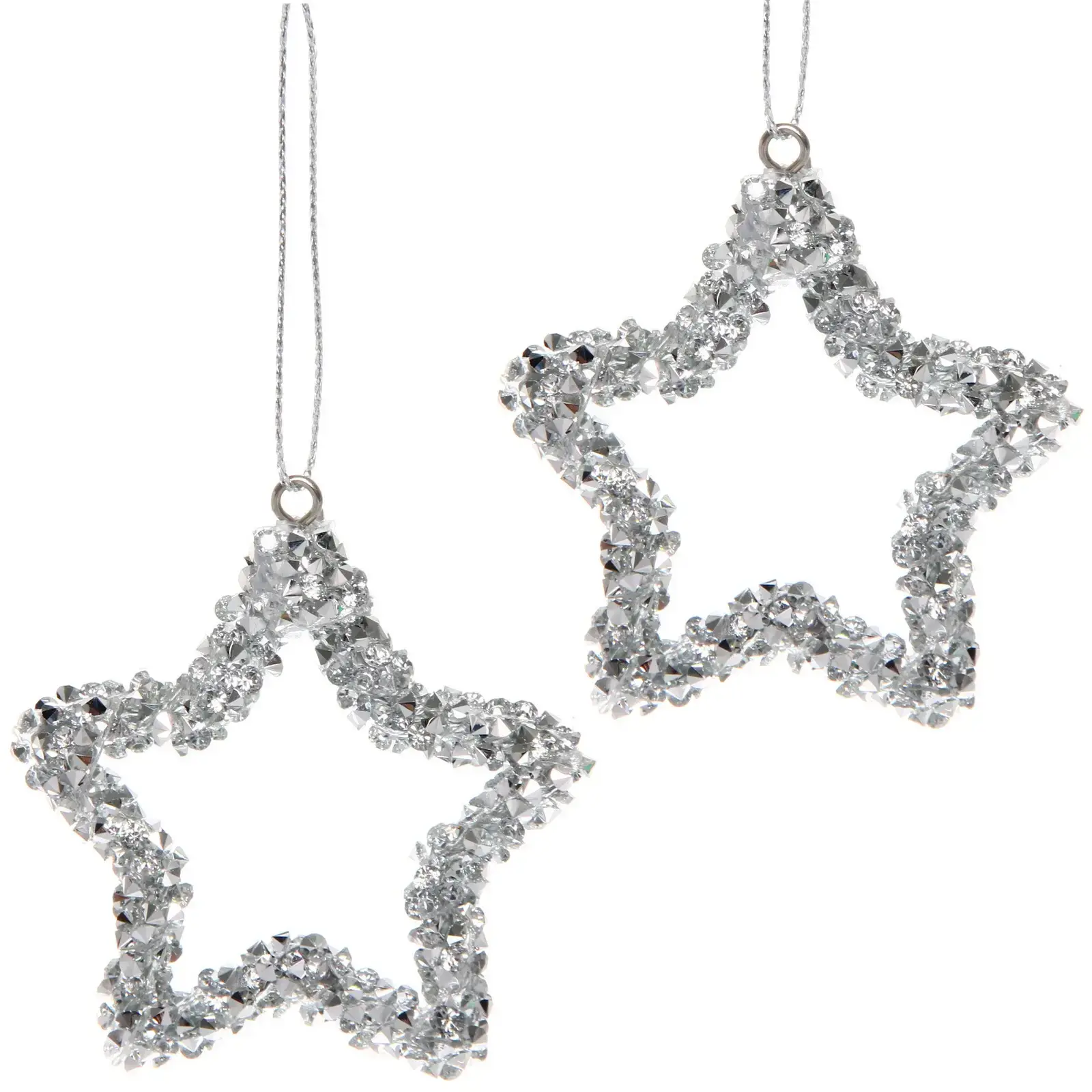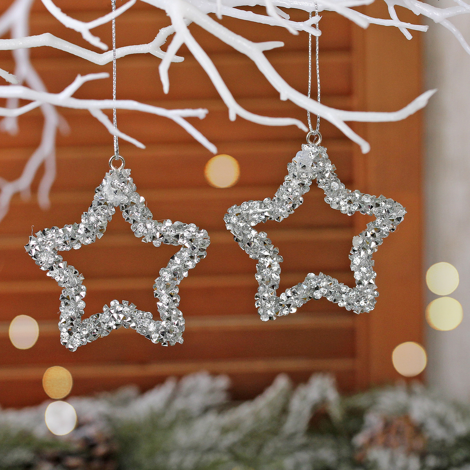 Каждая подвеска имеет размер 5х6 см и вес менее 50 г. Ажурный контур звезды образован прозрачными вставками с эффектом преломления света. Серебристая основа гармонично сочетается с классическими и современными стилями оформления.