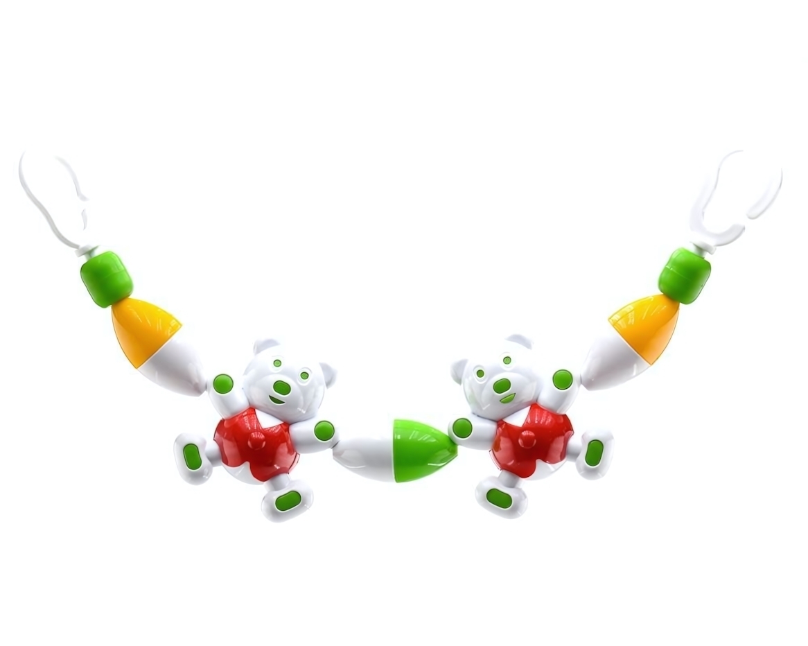 Игрушка изготовлена из безопасного пластика с гладкой поверхностью, не имеет острых углов. Ее размер (30-40 см) отлично подходит для новорожденных. Медведи в бело-зелено-красной цветовой гамме соединены элементами в форме конусов желтого и зеленого цветов.