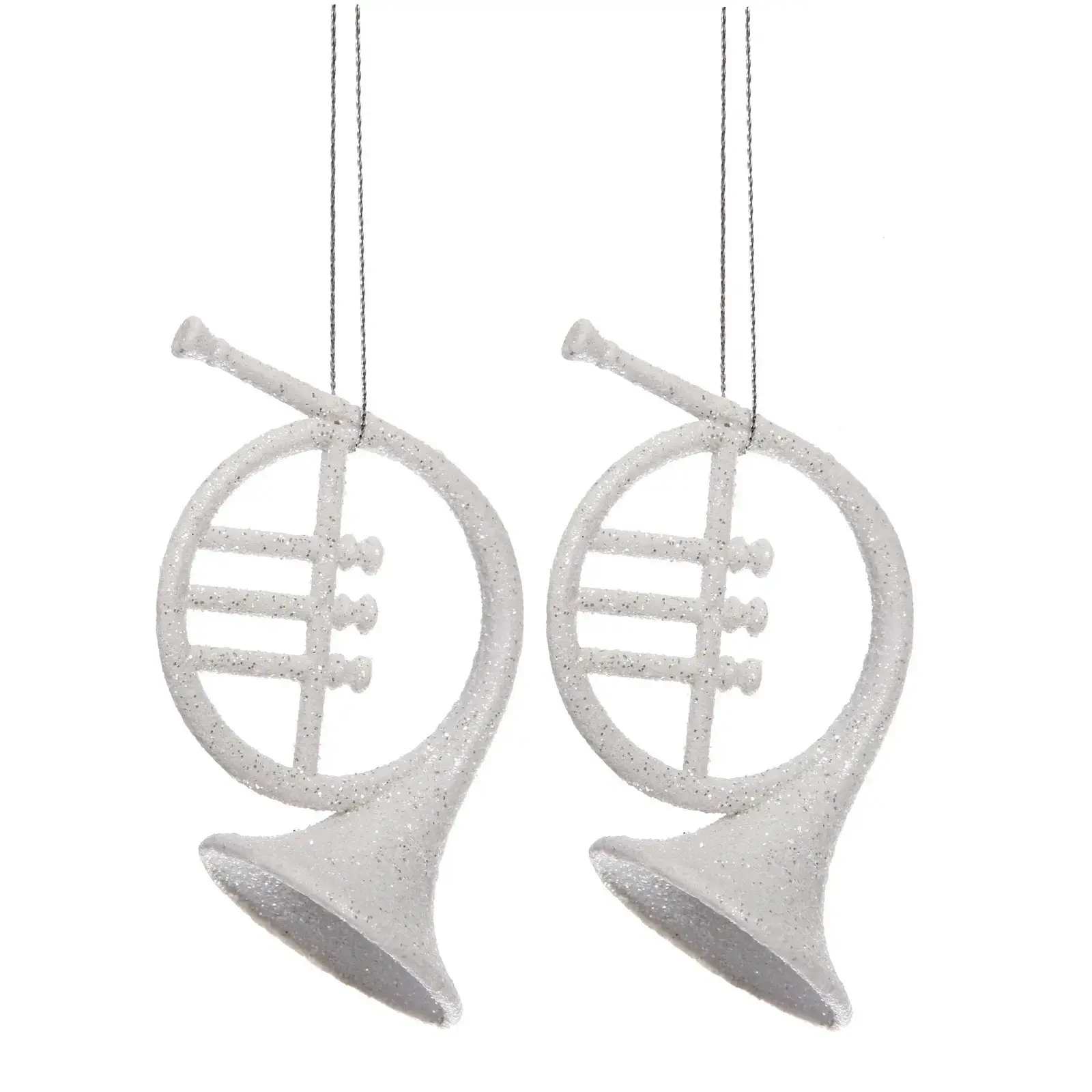 Размер каждого украшения: 12 см в высоту. Материал изготовления — ударопрочный пластик с глиттерным напылением. Цвет: белый с серебристым мерцанием. В набор входит 2 полностью идентичных декоративных элемента с готовыми подвесными петлями.