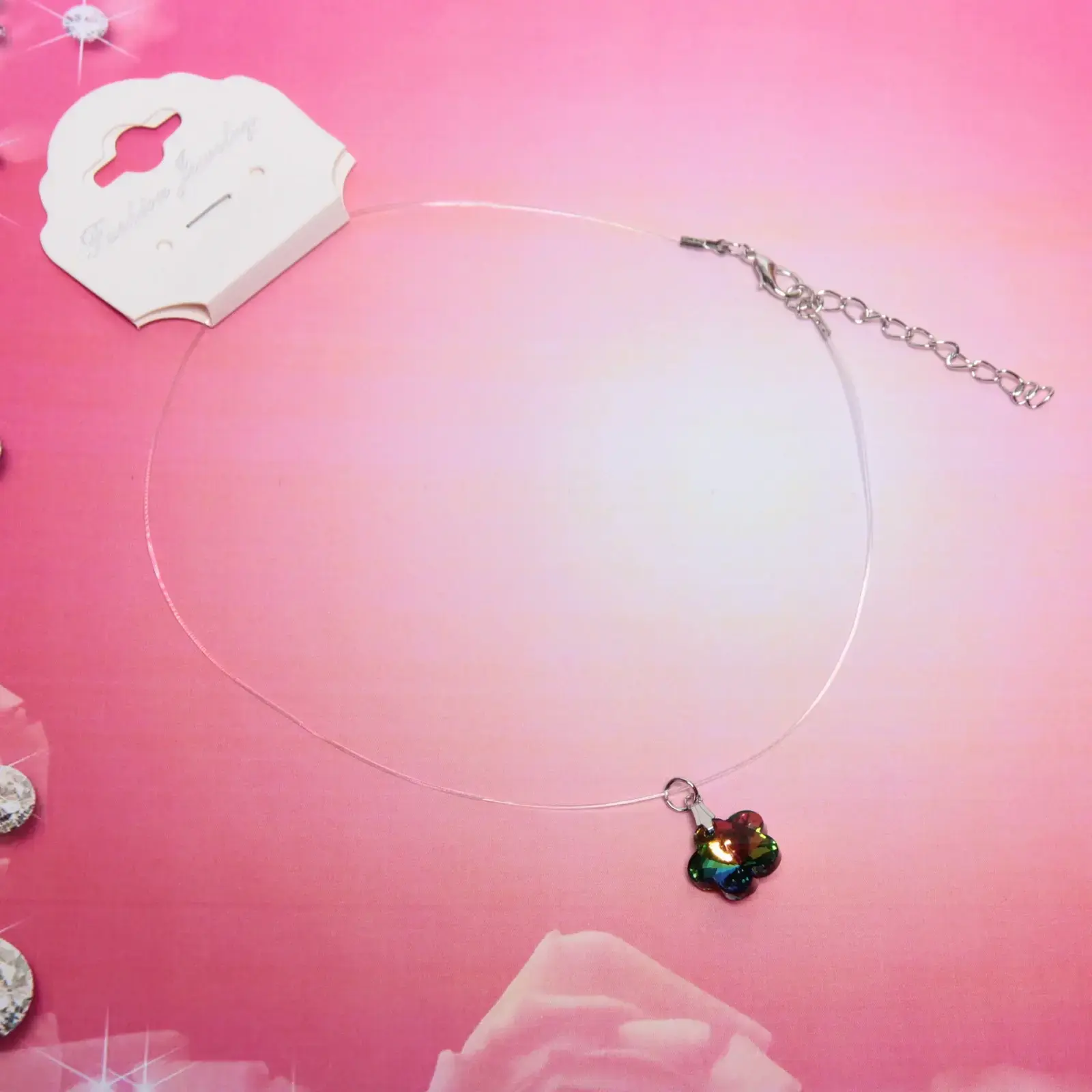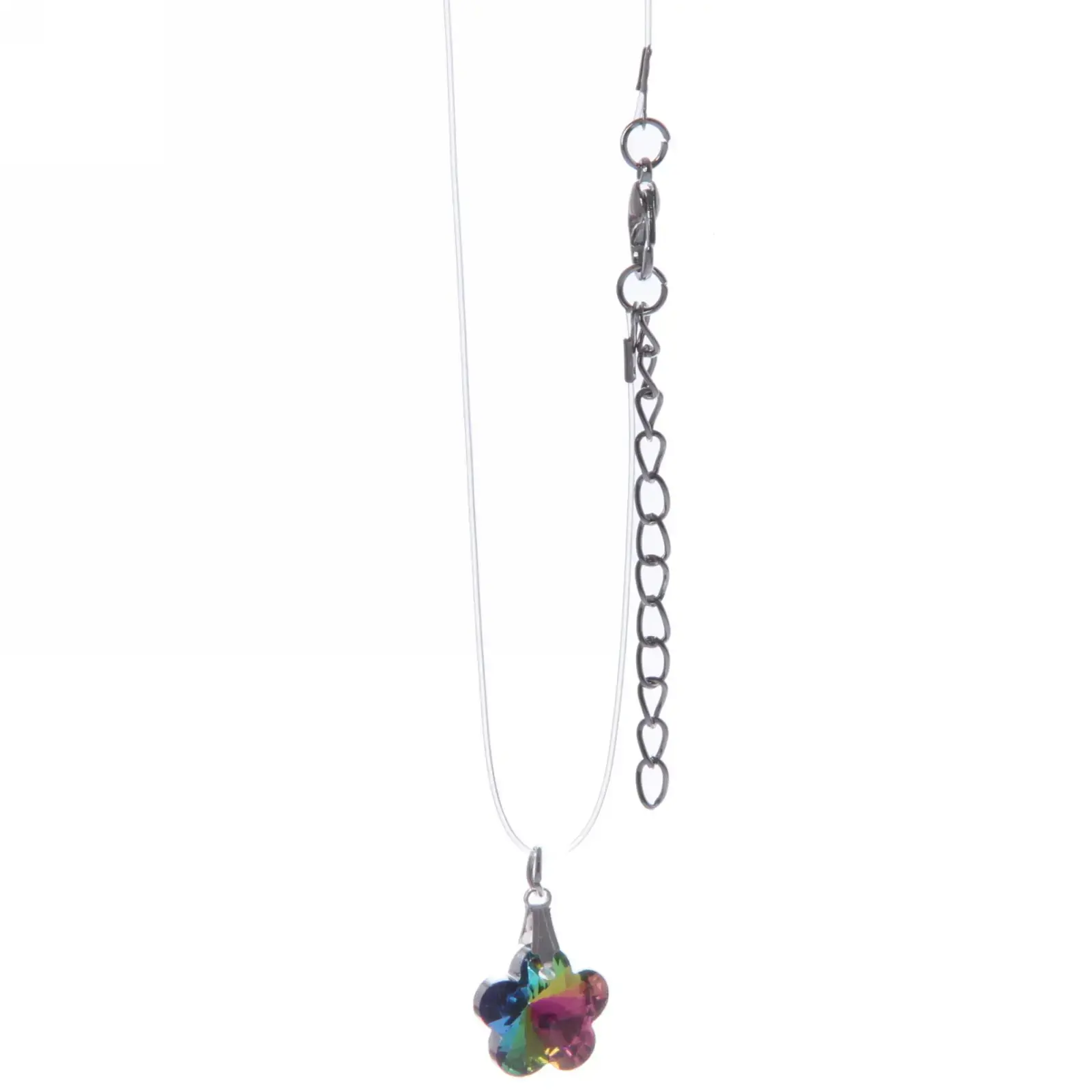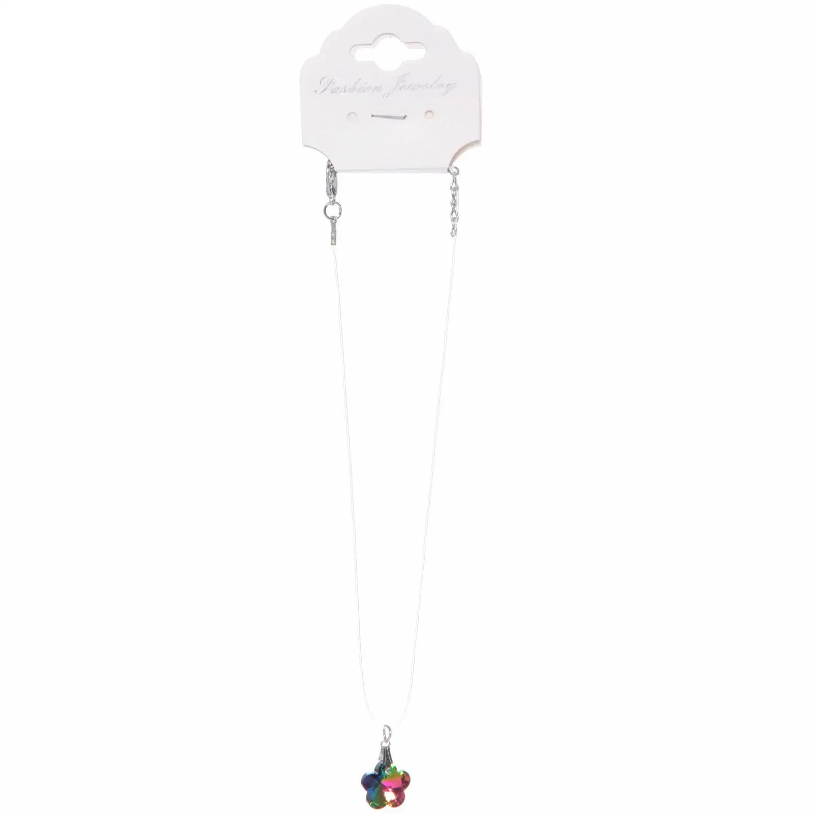 Подвеска выполнена в форме цветка и представлена в миксе из 5 ярких цветов: зеленого, синего, розового, фиолетового и желтого. Она легко крепится на тонкой прозрачной нити с металлическим замком, что позволяет регулировать длину ожерелья в зависимости от вашего наряда. Это украшение подходит как для повседневного использования, так и для праздничных мероприятий, добавляя нотку игривости и свежести.