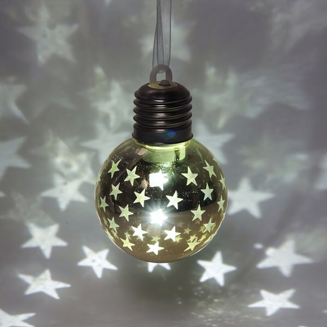 Шар легко крепится к любой потолочной или настенной точке с помощью предусмотренной петли. Прозрачный корпус позволяет свету свободно распространяться, а звёздный узор проецирует нежные сияющие пятна на стены и потолок. Идеально подходит для украшения новогодней ёлки, детской комнаты, ванных комнат, гостиных и коммерческих пространств.