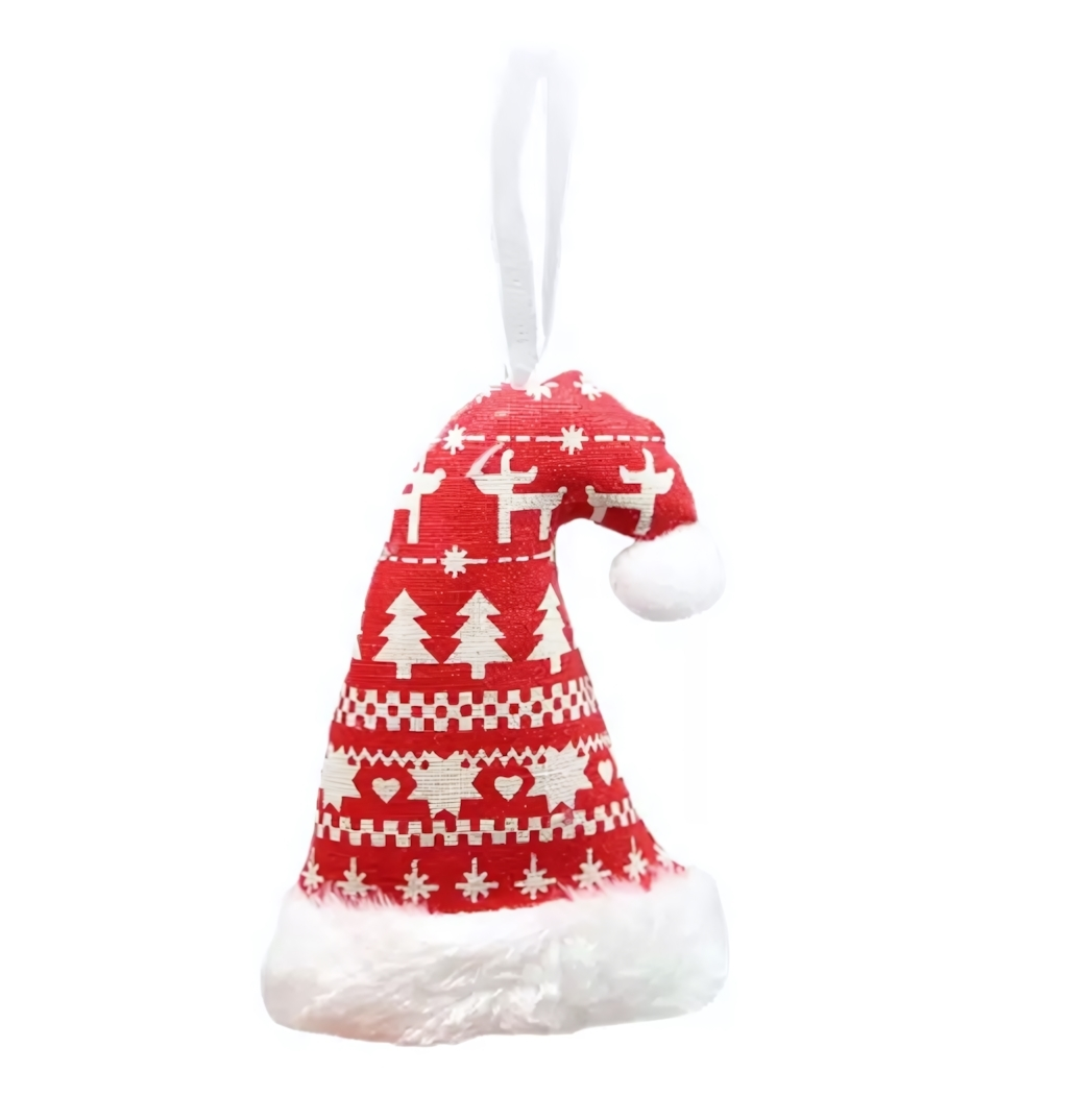 Подвеска имеет размеры 12,5 см и выполнена в красном цвете с белым узором, на котором изображены олени, деревья и снежинки. Такой дизайн создает настроение настоящего зимнего чуда и прекрасно впишется в любой интерьер. На верхней части шапки предусмотрена петелька, что позволяет легко повесить украшение на ёлку или в любом другом месте.