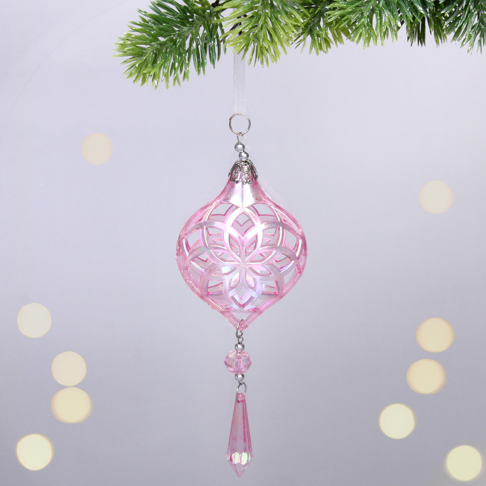 Подвеска «Сказочные узоры» — это идеальное украшение для вашего новогоднего интерьера, которое добавит волшебства и уюта в праздничные дни. Выполненная в нежном розовом цвете, она станет ярким акцентом на вашей елке или в любом другом месте, где вы решите ее разместить.