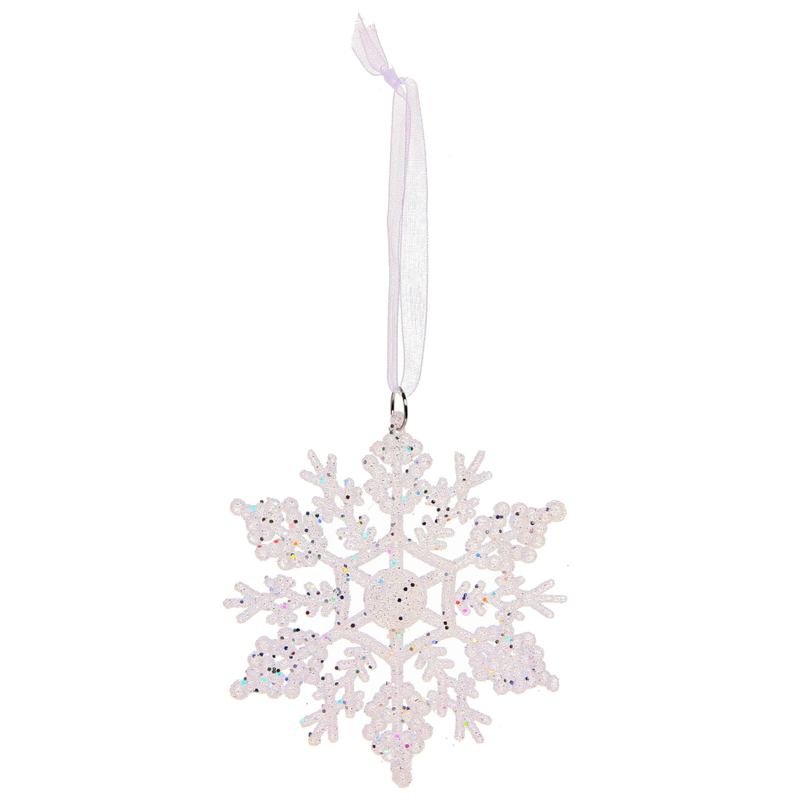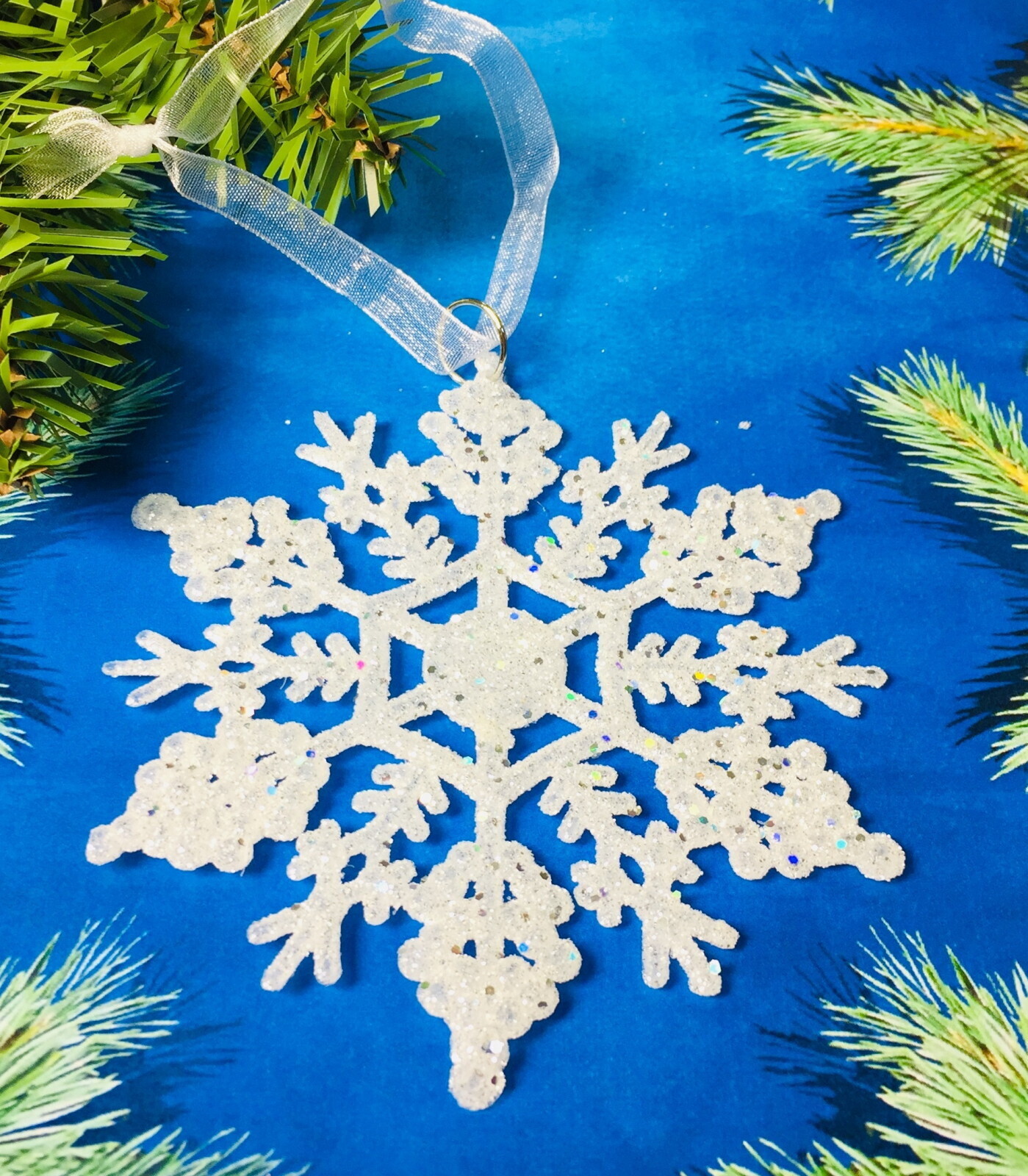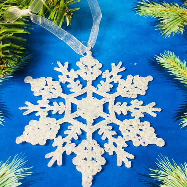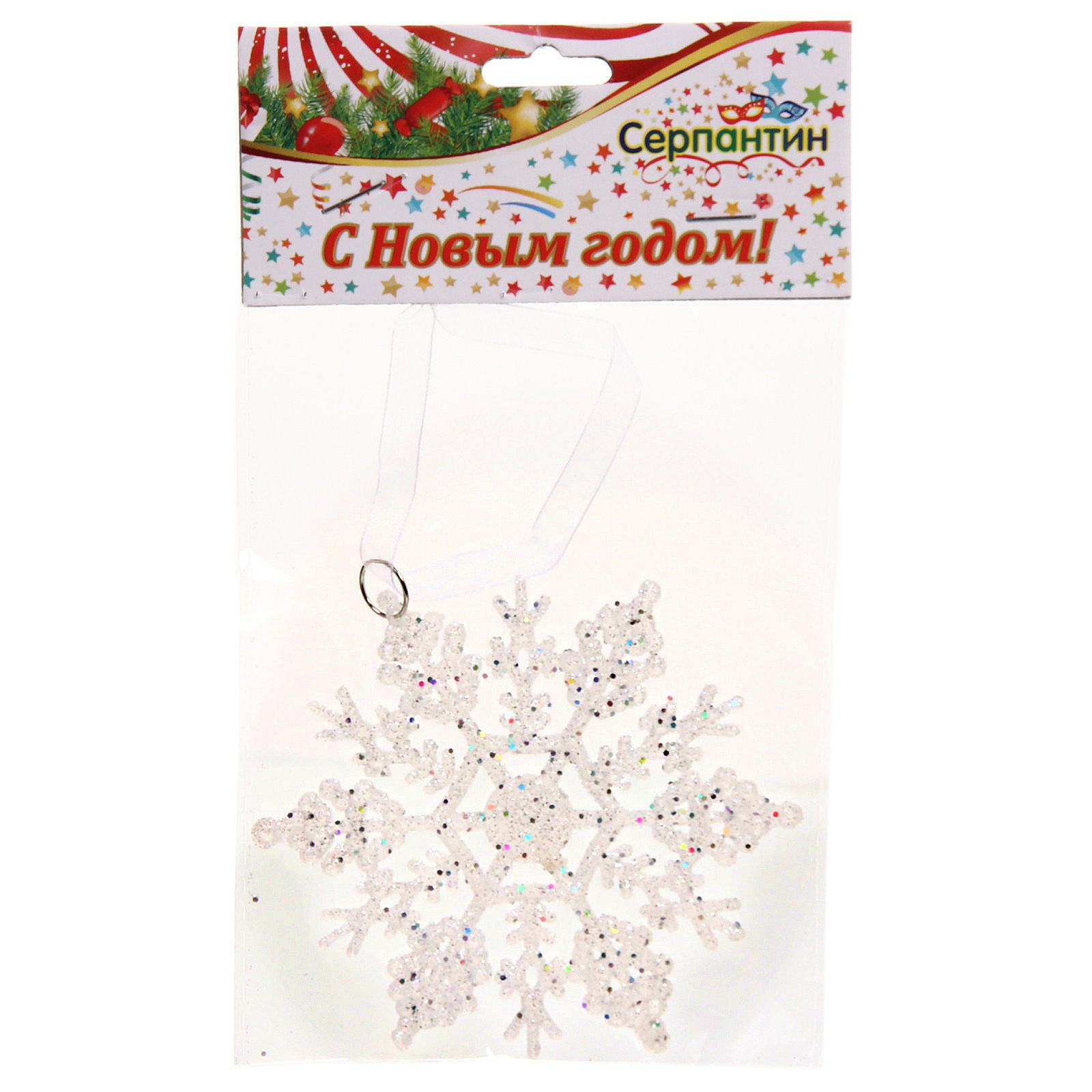 Размер подвески составляет 9 см, что делает ее компактной и удобной для размещения. Белый цвет с блестками придает изделию праздничный вид, а прозрачная лента позволяет легко и быстро повесить снежинку в любом месте. Это украшение станет отличным дополнением к вашему новогоднему декору и подарит радость вам и вашим близким.