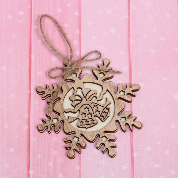 Подвеска снежинка‑колокольчики, натуральный фанерный орнамент, размер 10×11 см, светлый цвет, джутовый шнур