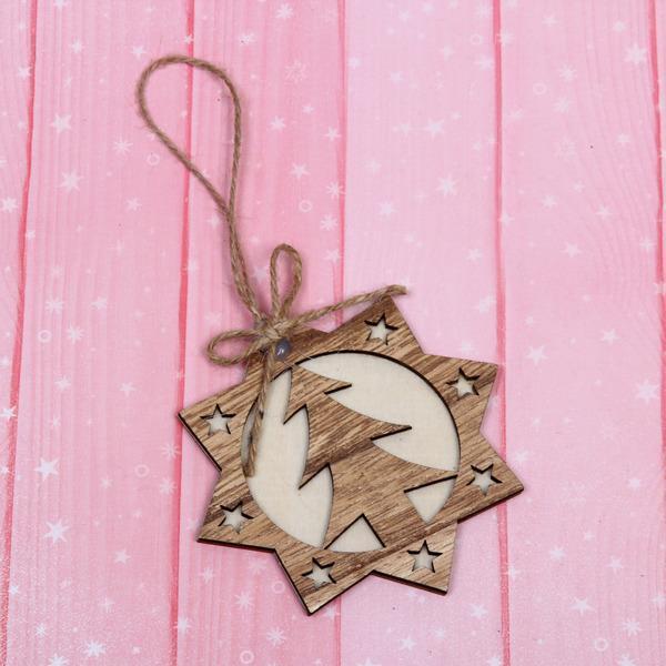 Добавьте уют и атмосферу зимнего праздника с декоративной подвеской "Снежинка-ёлочка". Она оформлена в виде восьмиконечной снежинки с изящным круглым вырезом, внутри которого вырезан силуэт ёлки. Подвеска гармонично сочетает в себе простоту натурального материала и праздничную выразительность, создавая тёплый акцент в любом интерьере.