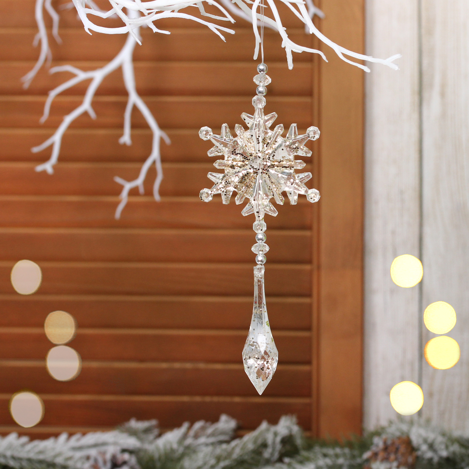 Высота подвески составляет 18 см, что делает её заметной, но не громоздкой. Конусообразная форма с заостренным концом создает элегантный силуэт, а встроенная снежинка добавляет нотку зимней магии.