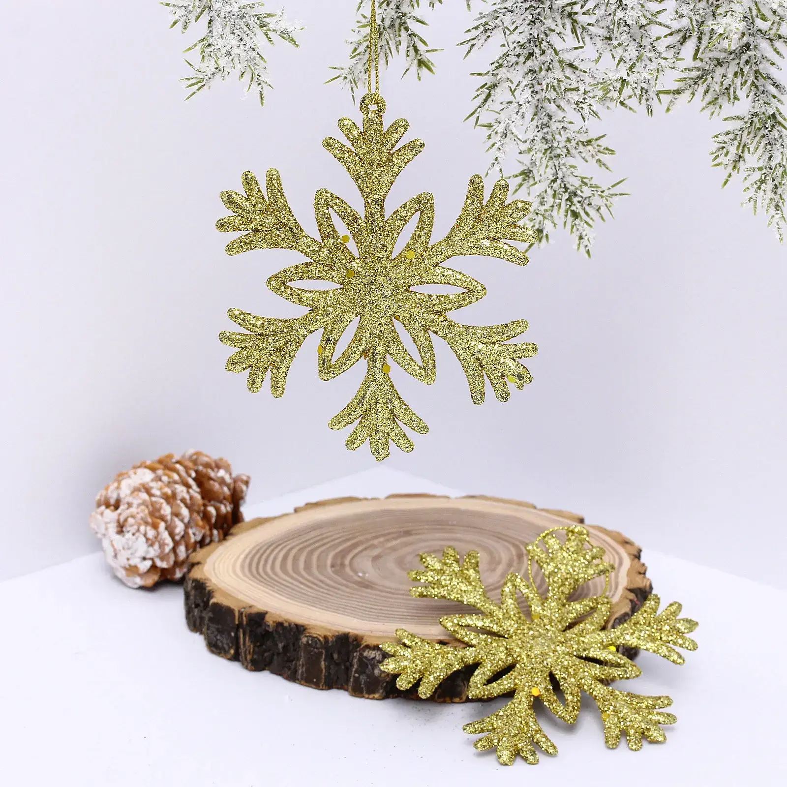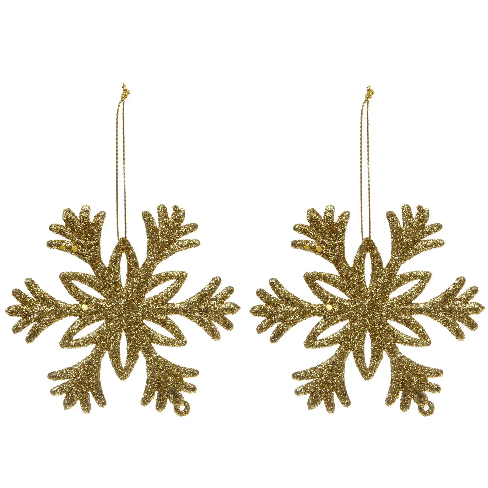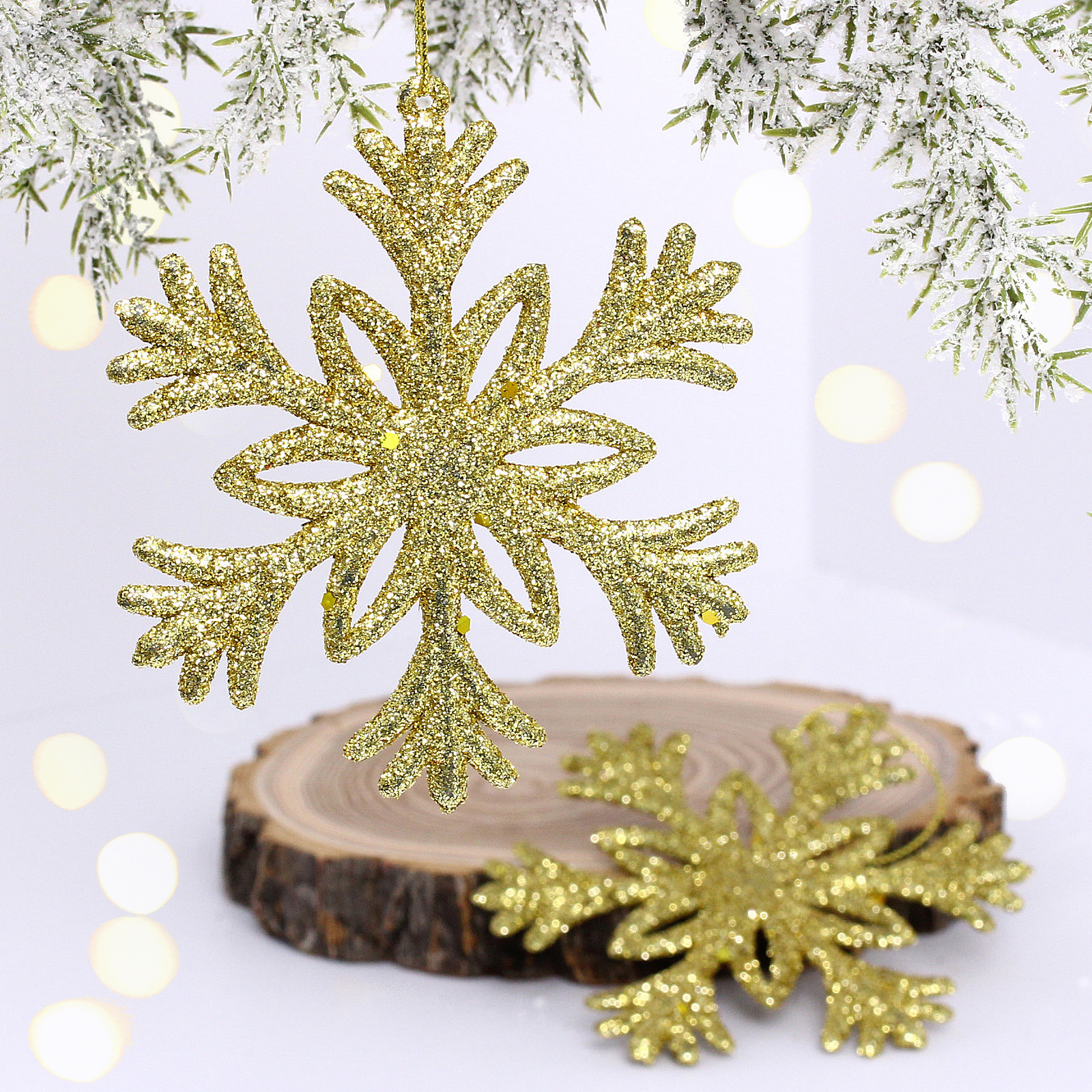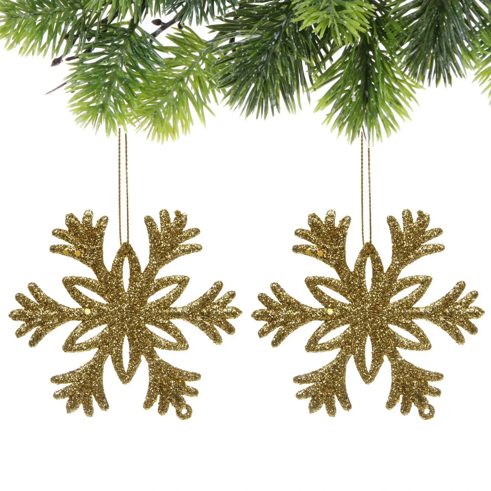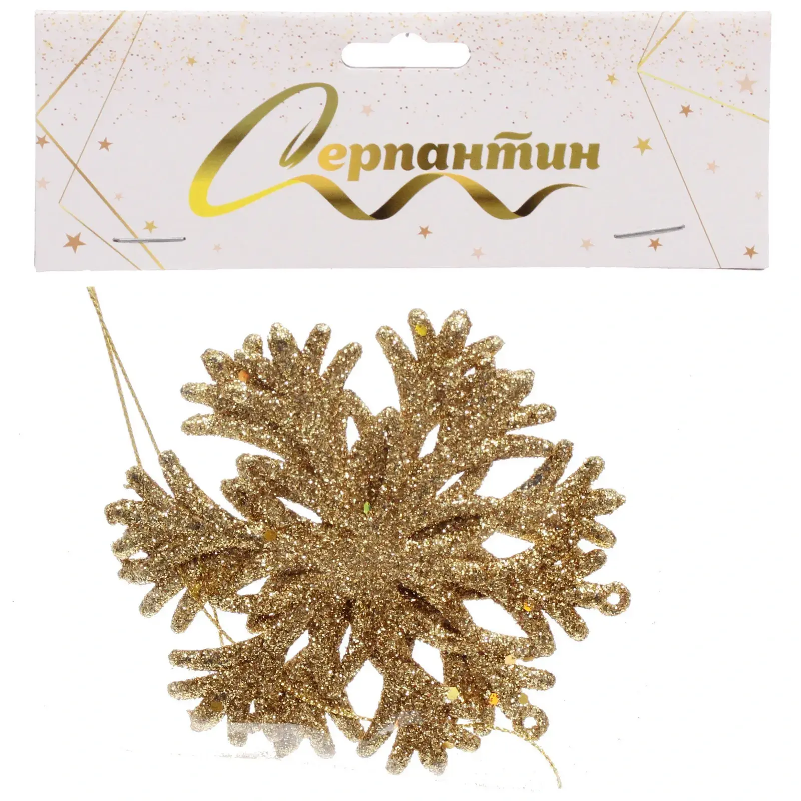 Размер каждой снежинки составляет 10 см, что делает их достаточно заметными, но не слишком громоздкими. Золотой цвет с блестящей текстурой добавляет изысканности и делает их отличным выбором для любого новогоднего декора. В наборе вы получите две снежинки, что позволяет вам использовать их в различных комбинациях для создания уникального оформления.