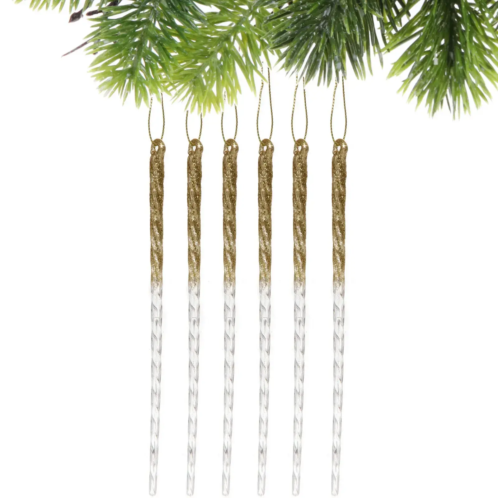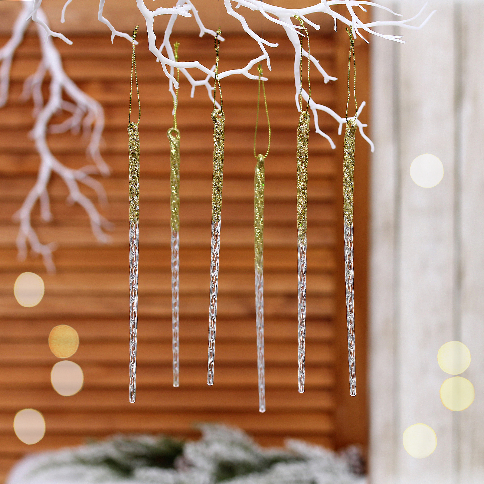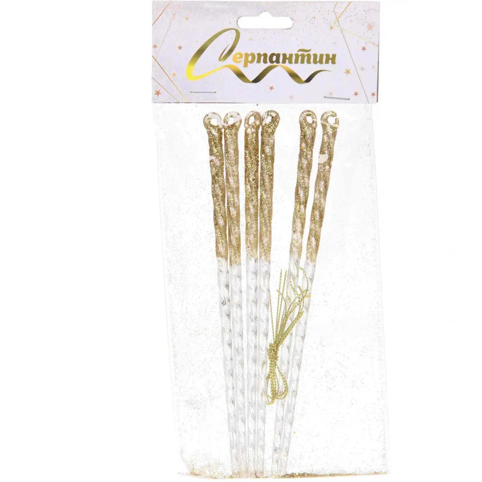 Создайте атмосферу волшебства и уюта с подвеской «Снежный хрусталь». Эти изящные украшения длиной 18 см, выполненные в золотом цвете с блестками, добавят яркие акценты в ваш новогодний декор. Каждая подвеска имеет гладкую, прозрачную нижнюю часть, создающую эффект градиента, что усиливает световые эффекты при освещении. Они идеально подходят для украшения елки, гирлянд или других праздничных элементов.
