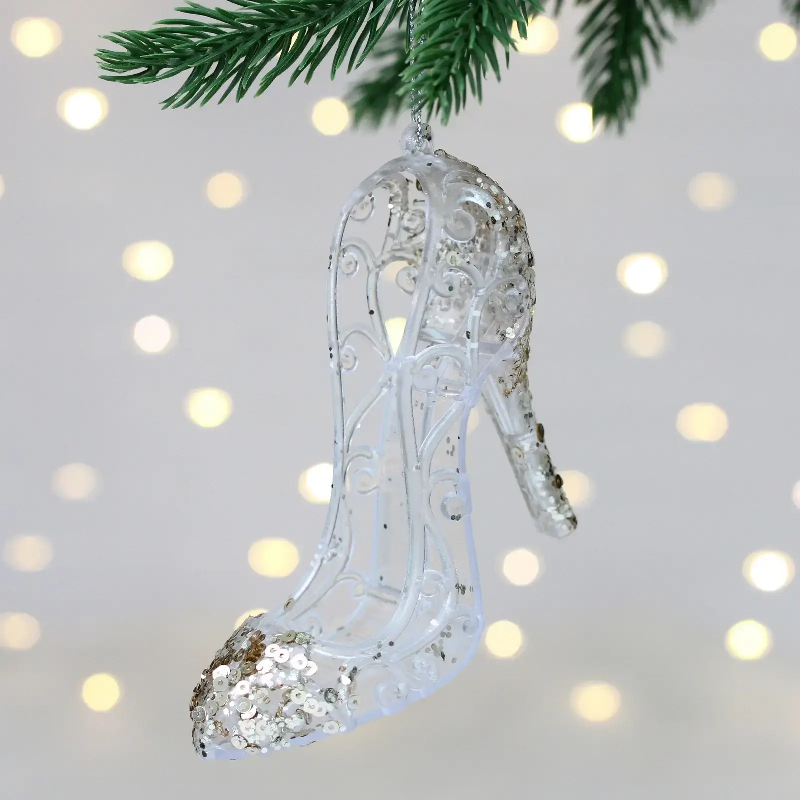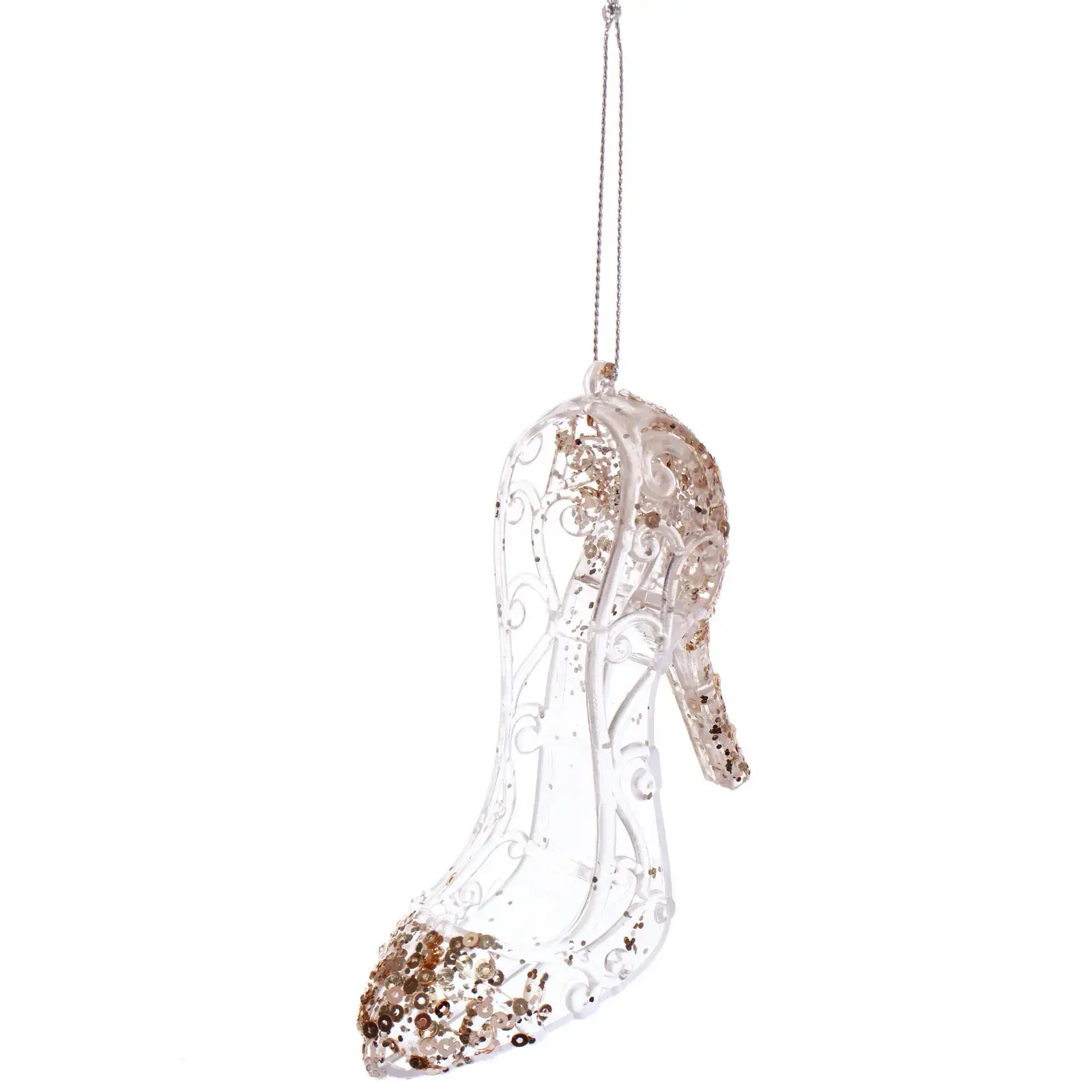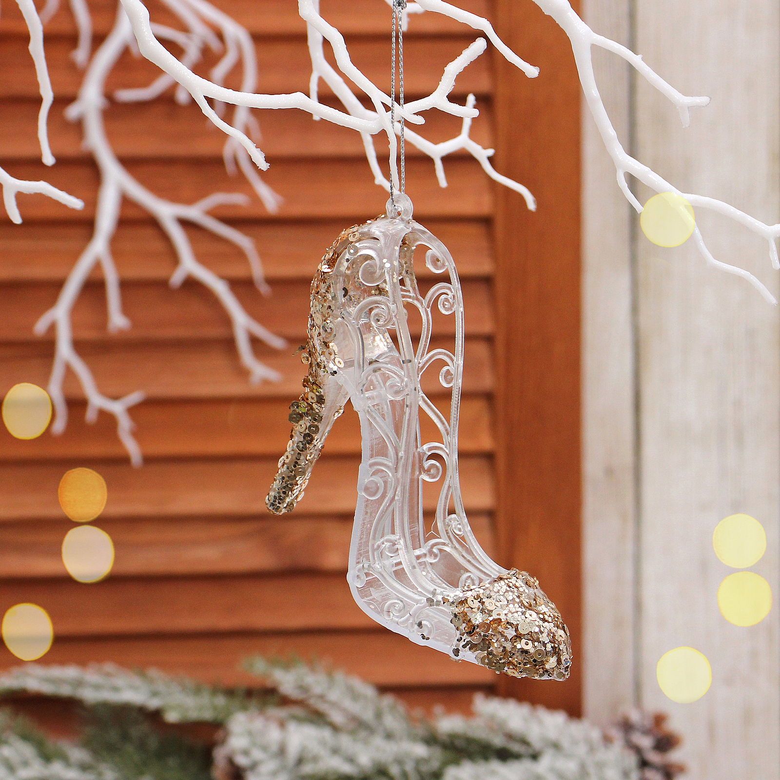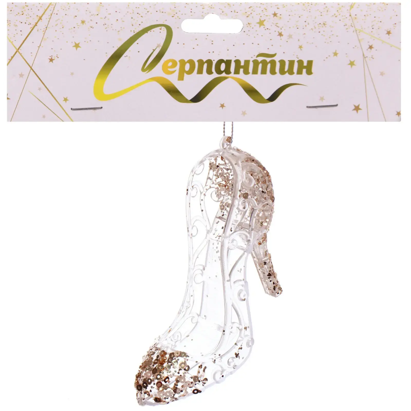 Эта изящная подвеска в форме туфли на высоком каблуке станет настоящим украшением вашего новогоднего декора. Сочетание белого цвета и золотого блеска придаёт ей особый шарм и элегантность, создавая атмосферу праздника и уюта. Подвеска выполнена из качественного пластика, что обеспечивает её долговечность и лёгкость.