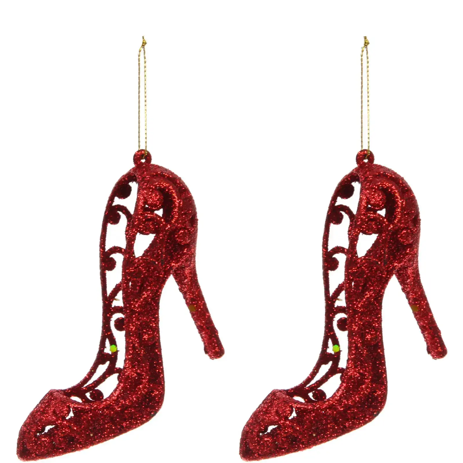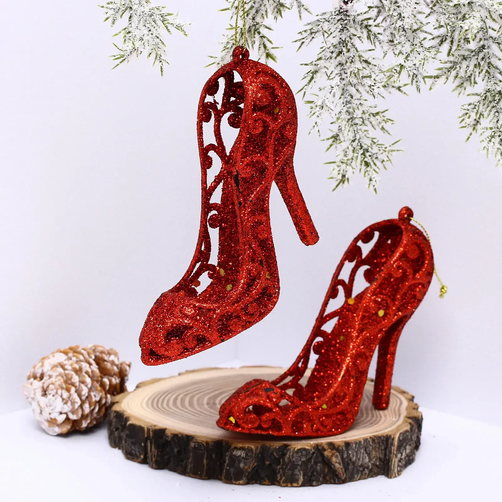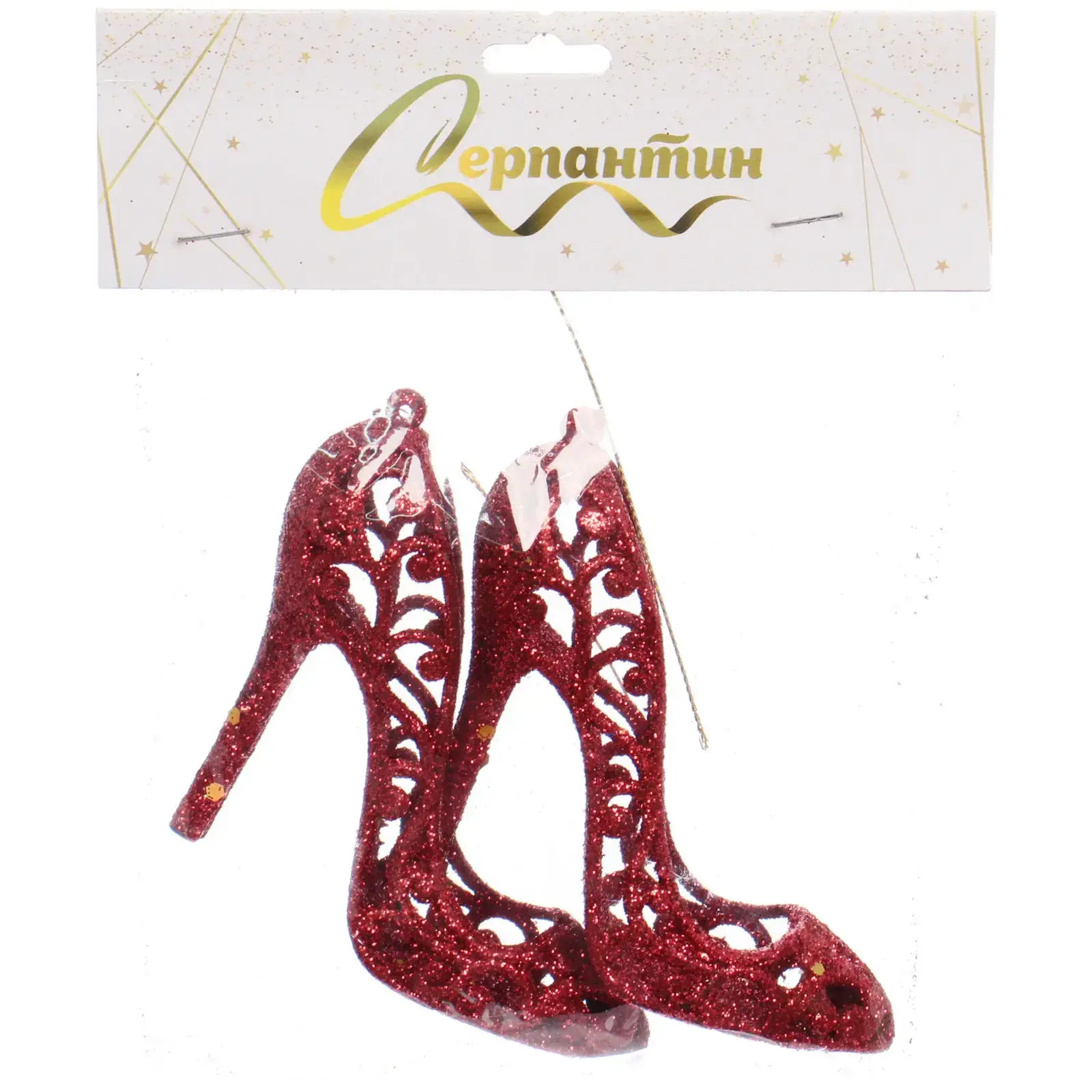 Эти яркие подвески в виде туфель на высоком каблуке добавят изысканности и праздничного настроения в любое оформление. Ярко-красный цвет и блестящая отделка создают эффект глиттера, который привлекает внимание и создает атмосферу праздника. Подвеска «Туфли» станет отличным дополнением к новогоднему декору, а также подойдет для оформления тематических вечеринок и мероприятий.