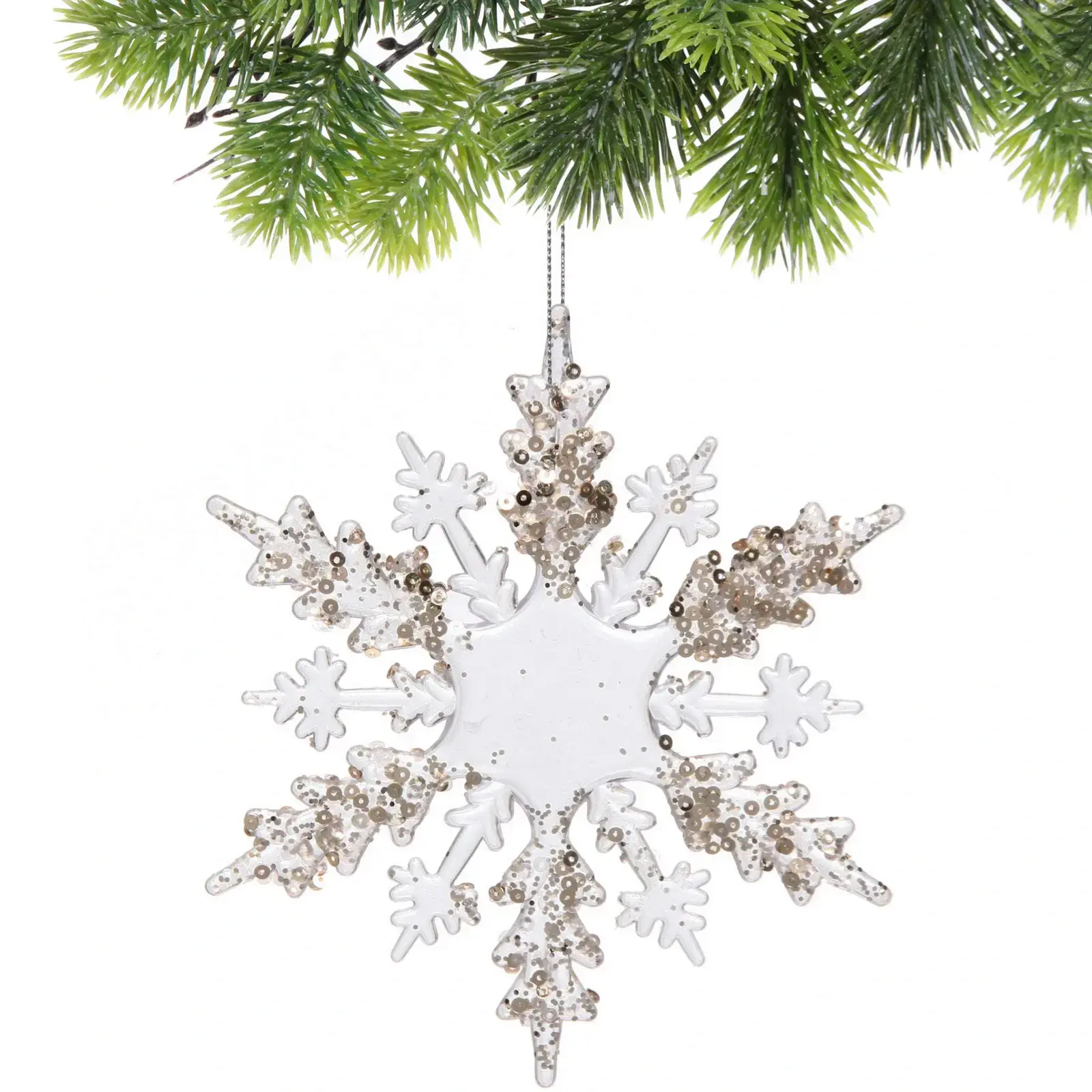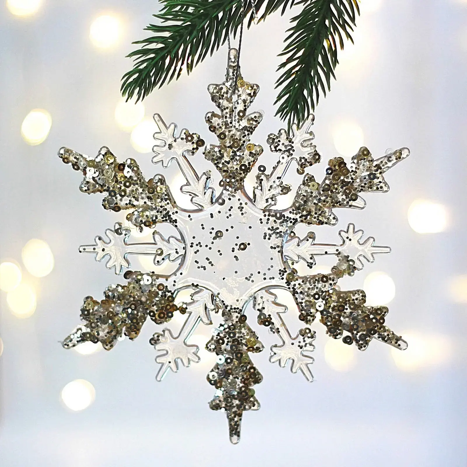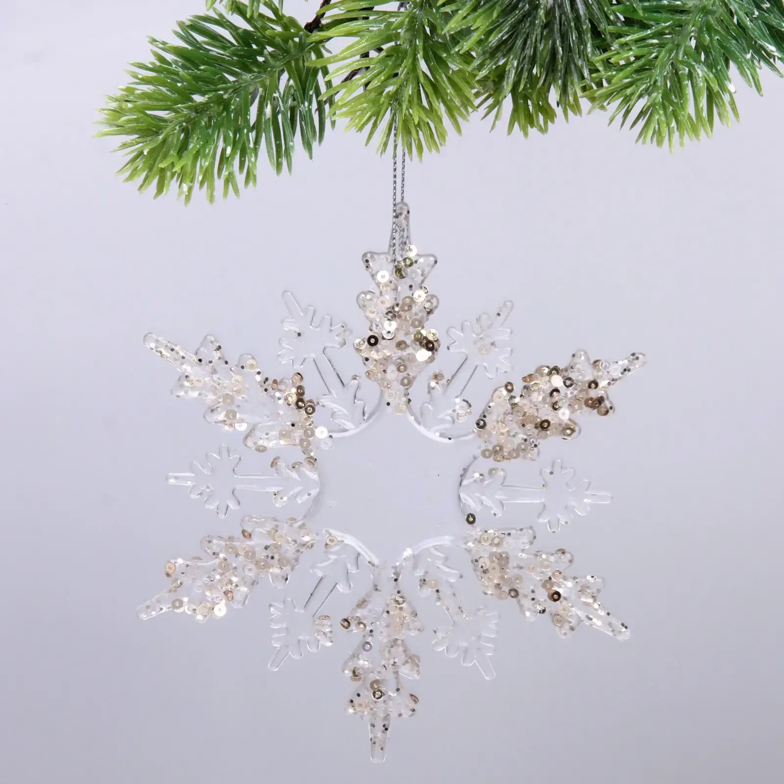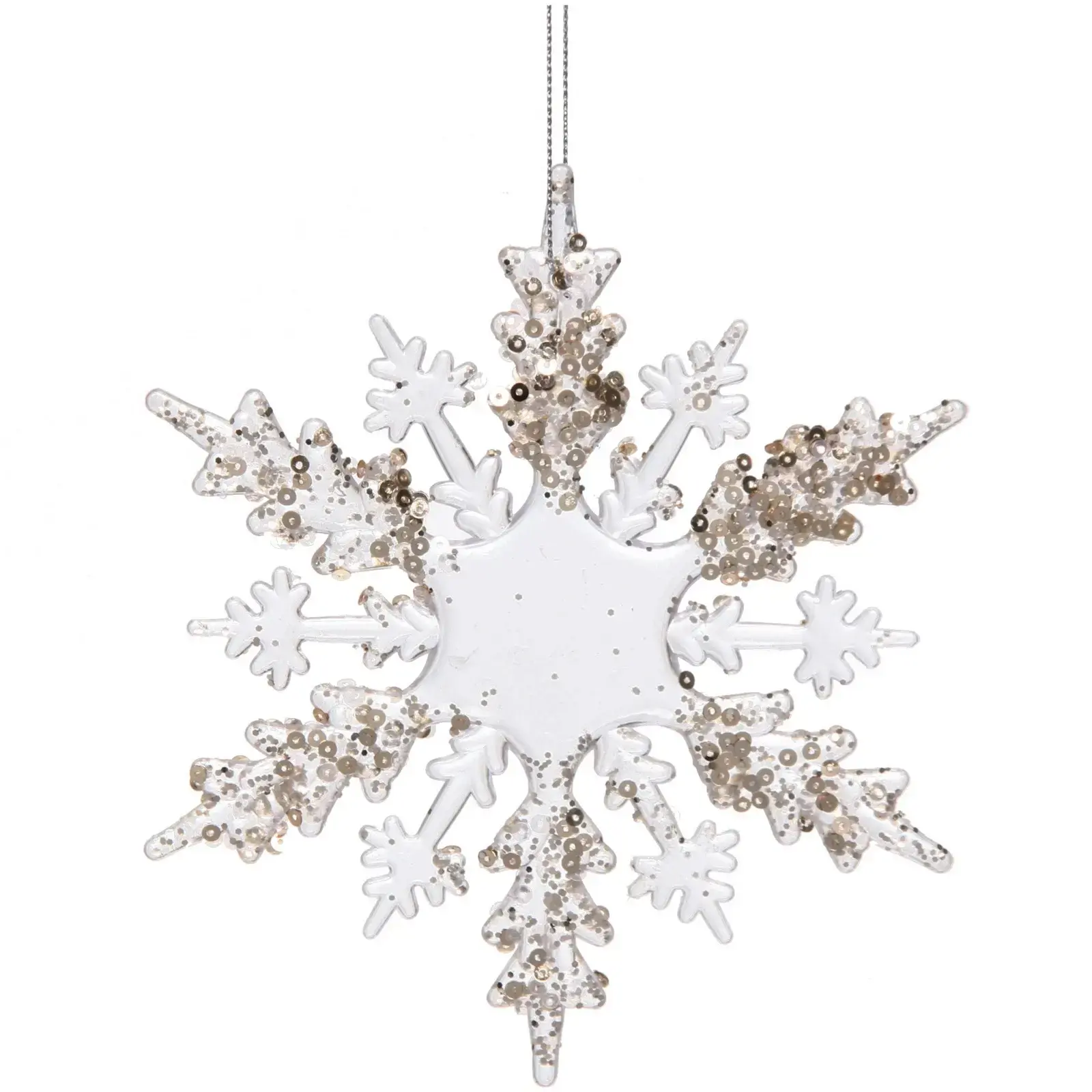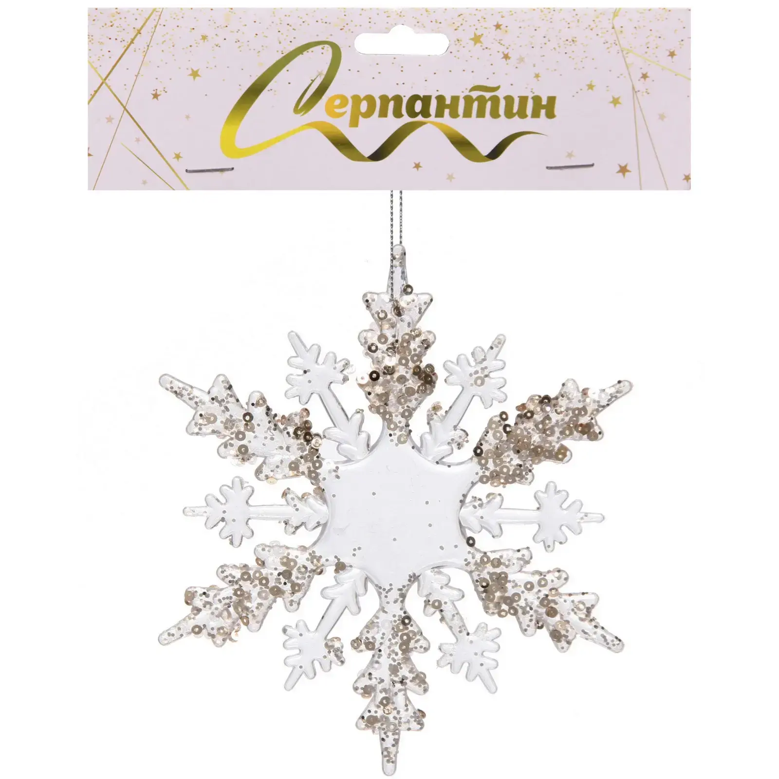 Эта изысканная подвеска в форме снежинки станет идеальным украшением для вашего новогоднего декора. С её помощью вы сможете добавить волшебства и уюта в ваш дом, создавая неповторимую атмосферу праздника. Белый цвет с золотыми блестками придаёт изделию элегантный вид, а прозрачный материал позволяет свету играть и создавать удивительные эффекты.
