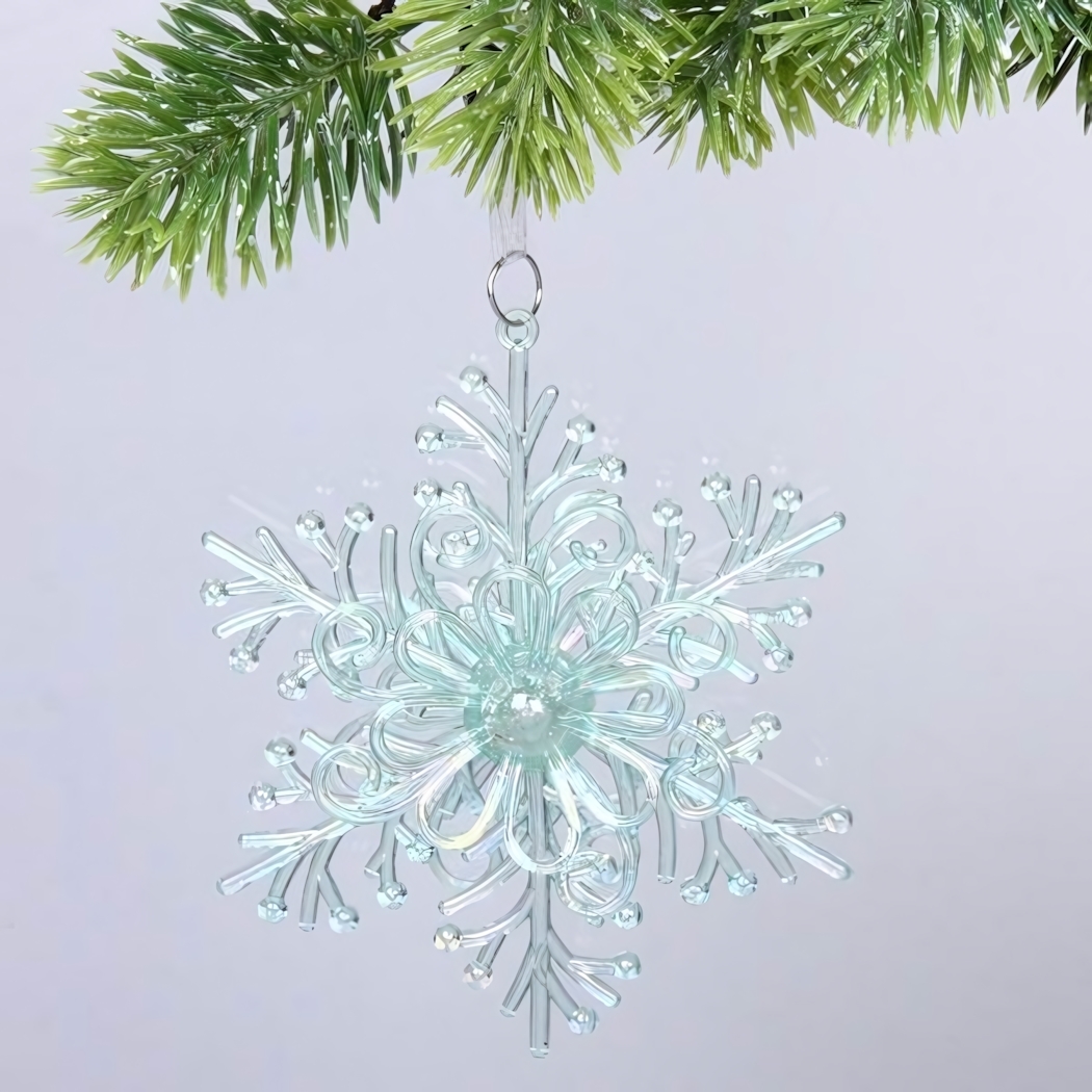 Подвеска "Волшебство зимы" — это изысканное украшение в форме снежинки, которое преобразит любую елку и создаст атмосферу зимней сказки. Благодаря изящным виткам, центральному цветочному элементу и блестящему акриловому материалу, она гармонично впишется в ваш праздничный интерьер.