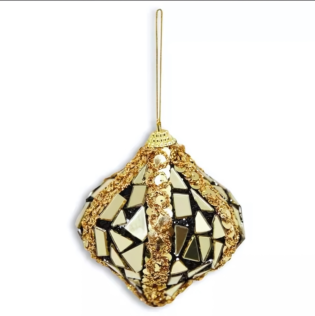 Подвеска "Зеркальный узор" — утончённый элемент праздничного оформления, который придаст ёлке или интерьеру особый шарм и изысканность. Мозаичный узор из зеркальных фрагментов и золотистых элементов отражает свет гирлянд, создавая атмосферу тепла и уюта в доме.