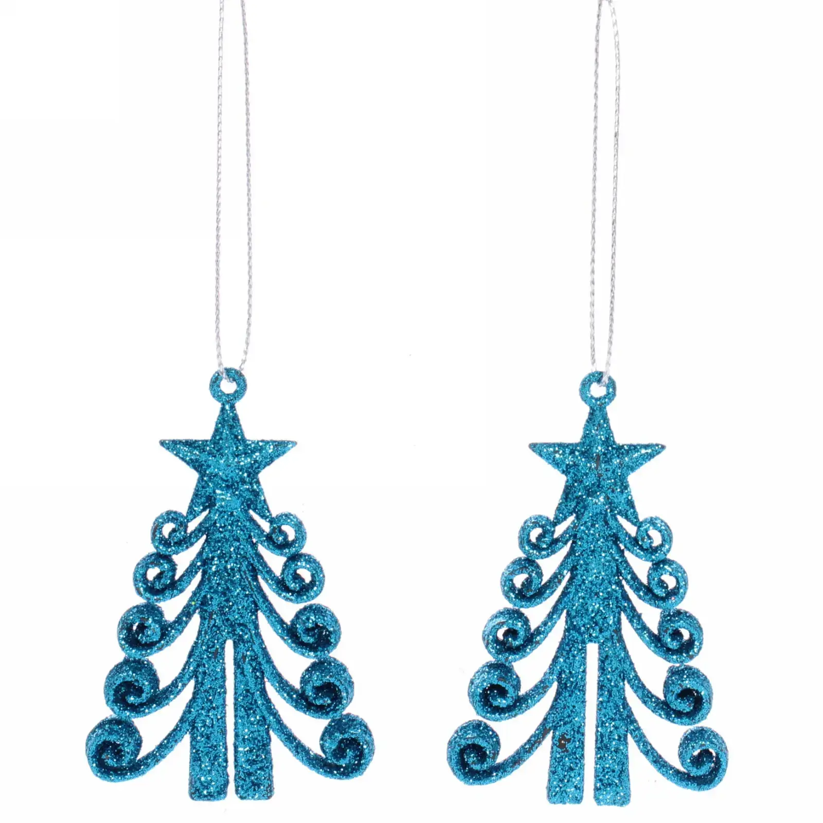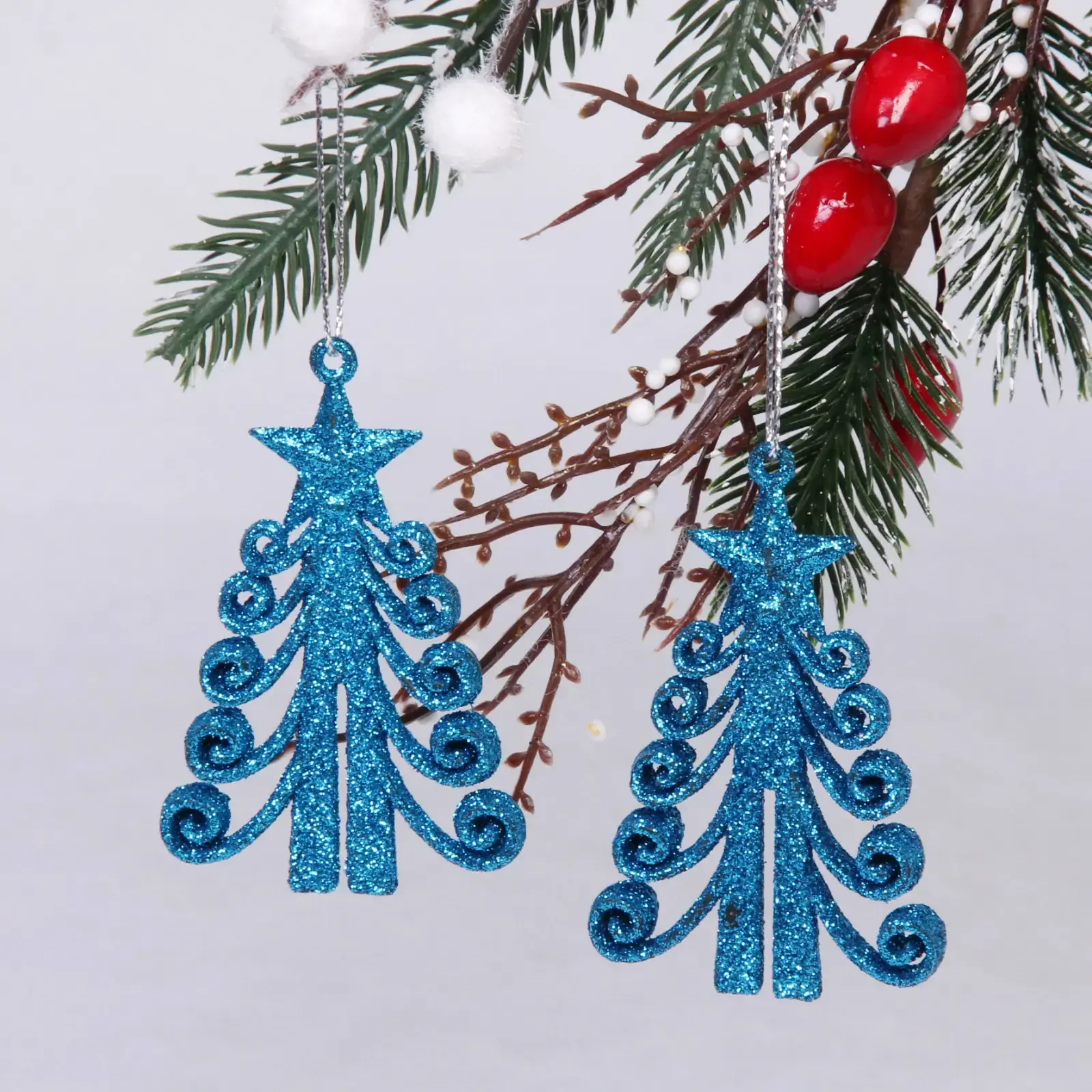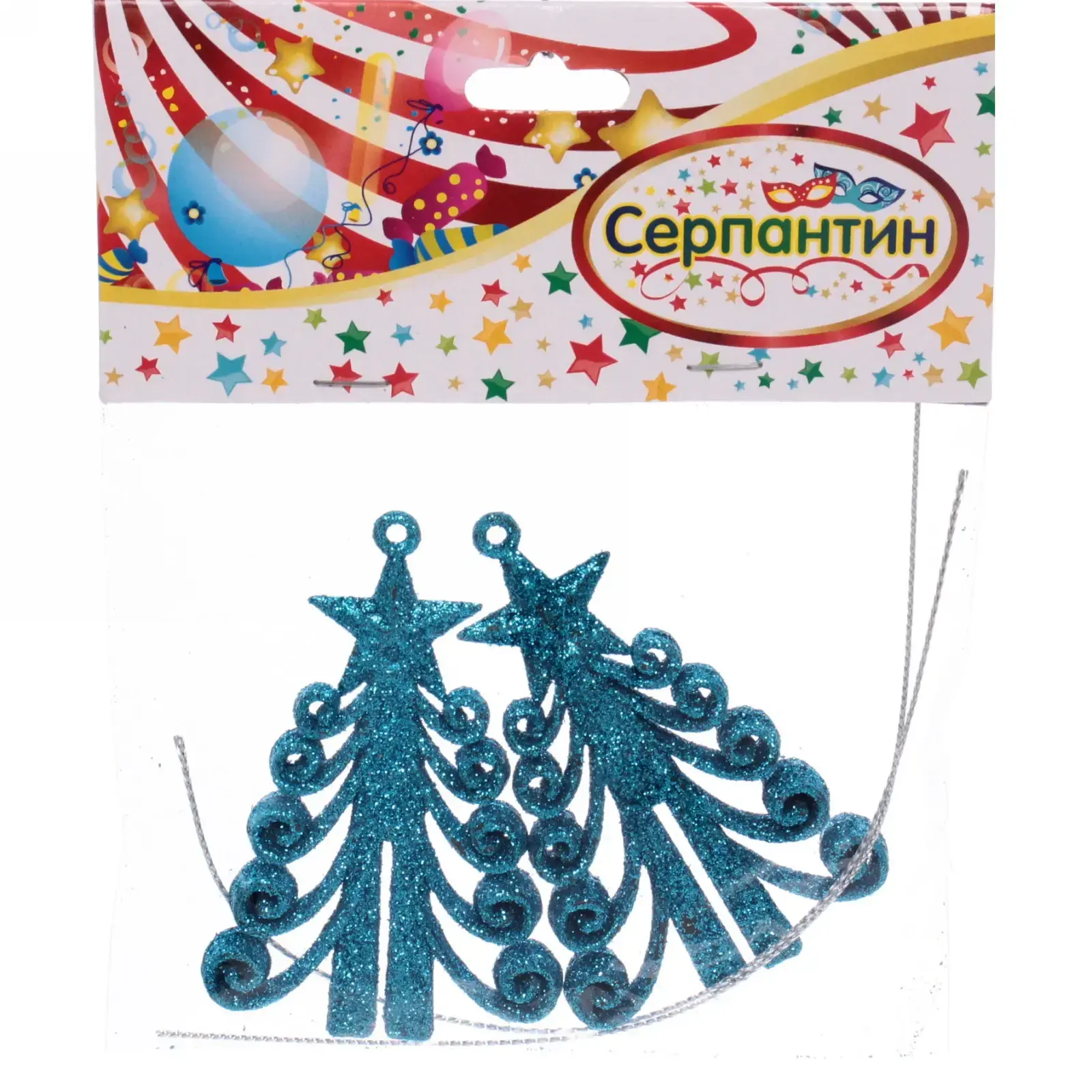 Эти яркие подвески в блестках станут идеальным дополнением к вашему новогоднему декору. Их насыщенный голубой цвет и блестящая поверхность создают праздничное настроение и привлекают внимание. Подвески выполнены в форме стилизованных елочек с закрученными ветвями и звездами на вершине, что делает их не только красивыми, но и оригинальными.