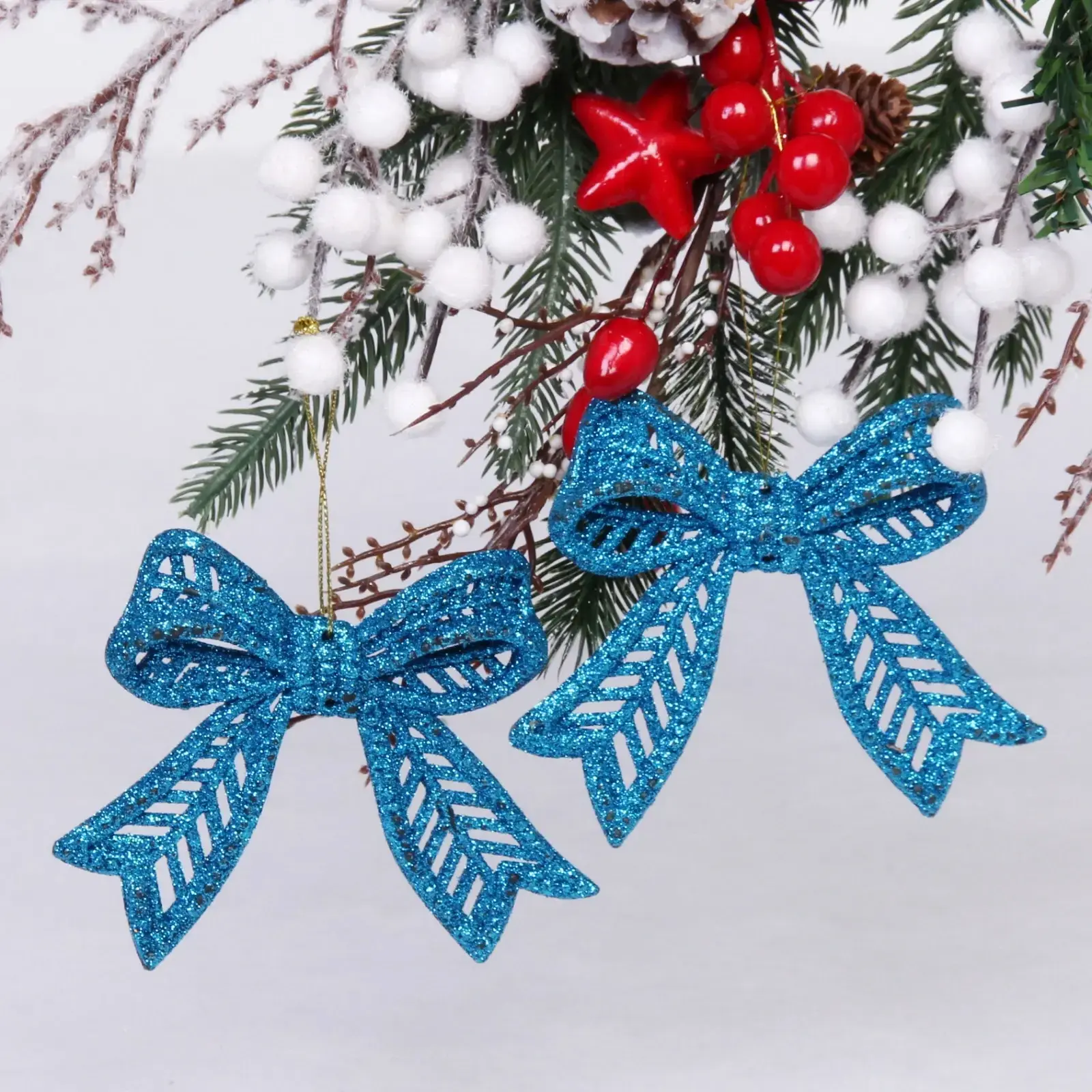 Выбирая наши подвески, вы получаете не только красивый, но и качественный продукт. Изготовленные из легкого пластика, они устойчивы к повреждениям и долго сохраняют свой первоначальный вид. Блестящая отделка придаёт им особый шарм, а золотистая нить для подвешивания обеспечивает удобство в использовании. Эти бантики станут отличным дополнением к вашему праздничному декору.