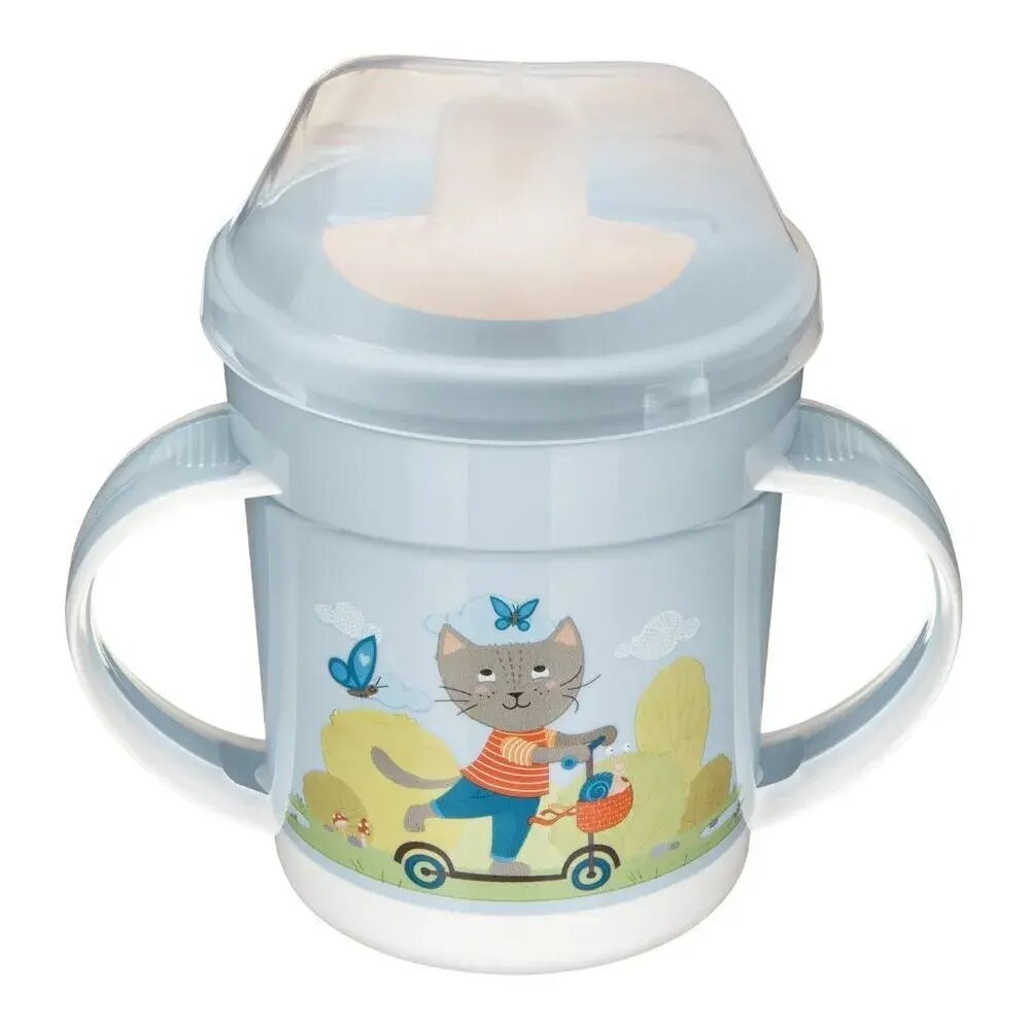 Поильник детский с защитной крышкой и ручками, 320 мл, рисунок кота на велосипеде, пластик, светло-голубой