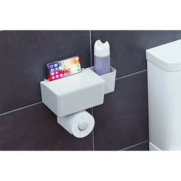 Настенная полка Glomma сочетает функциональность и минимализм: компактный держатель для рулона туалетной бумаги и контейнер для средств гигиены экономят пространство, сохраняя порядок. Идеальное решение для современных интерьеров с акцентом на практичность.