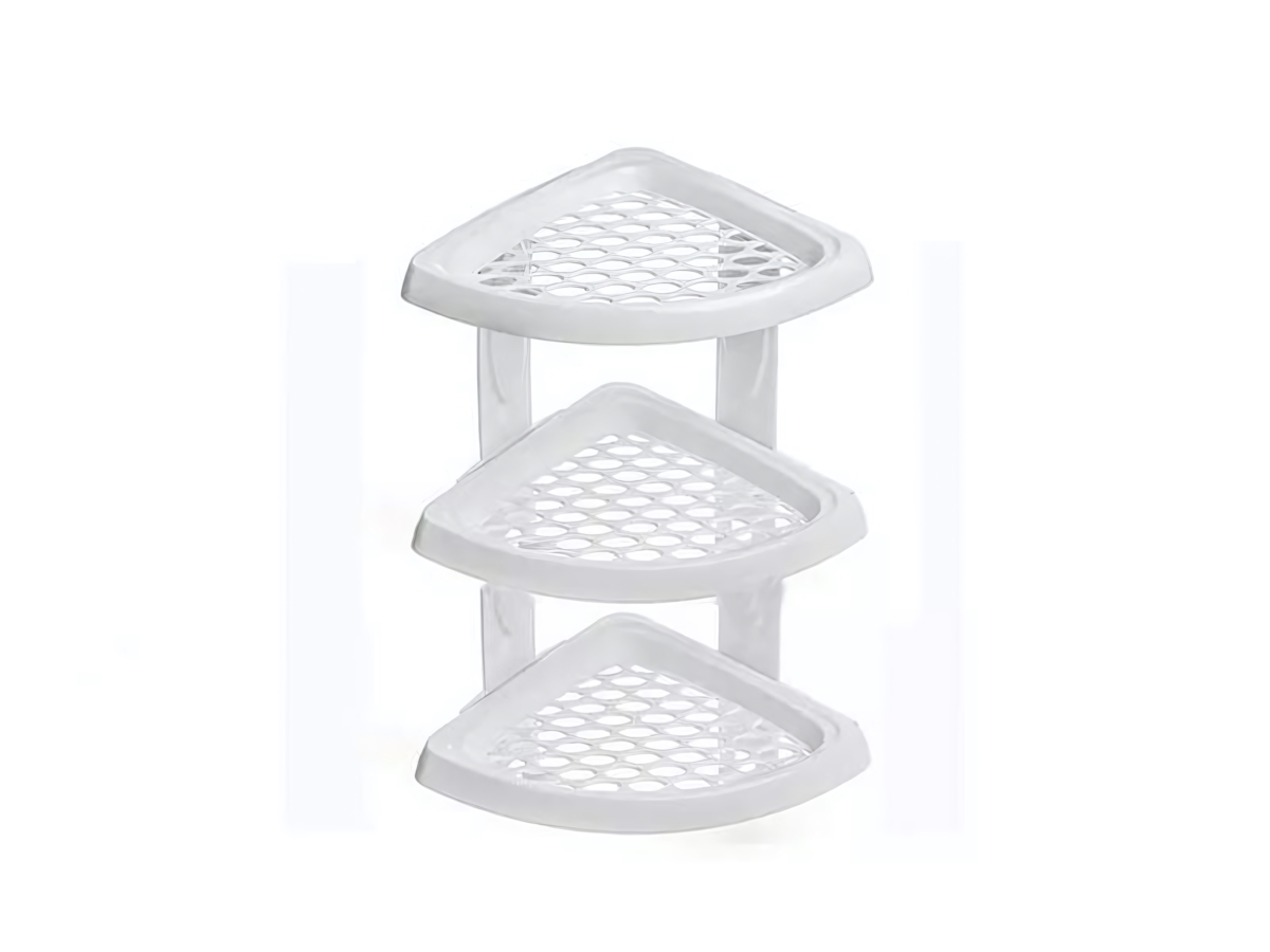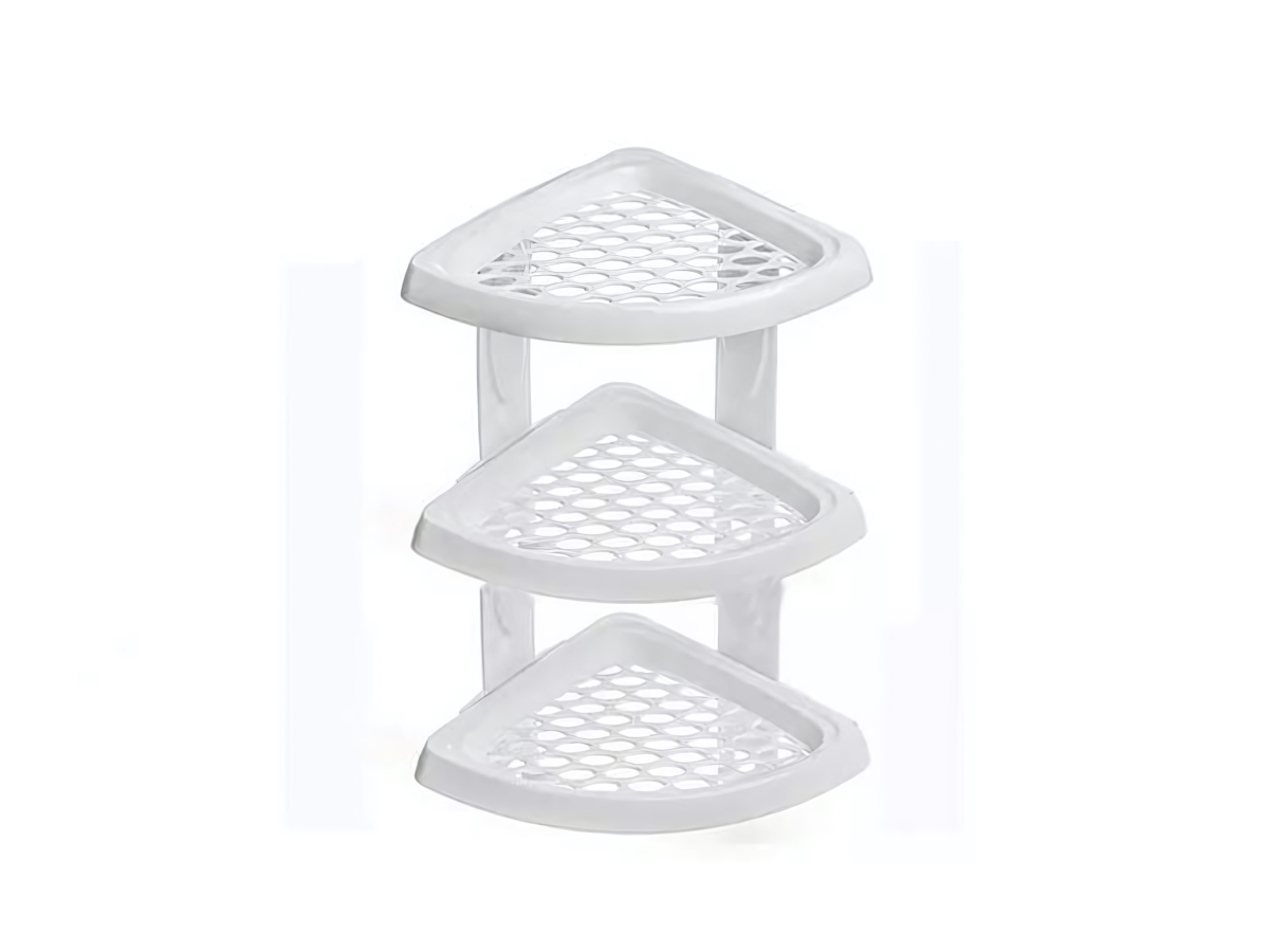 Три вместительных секции с перфорированной поверхностью обеспечивают циркуляцию воздуха и быстрый отвод влаги, позволяя хранить шампуни, гели, мыло и другие предметы гигиены без риска скопления влаги. Высокие бортики на каждой полке гарантируют, что даже мелкие вещи останутся на месте.