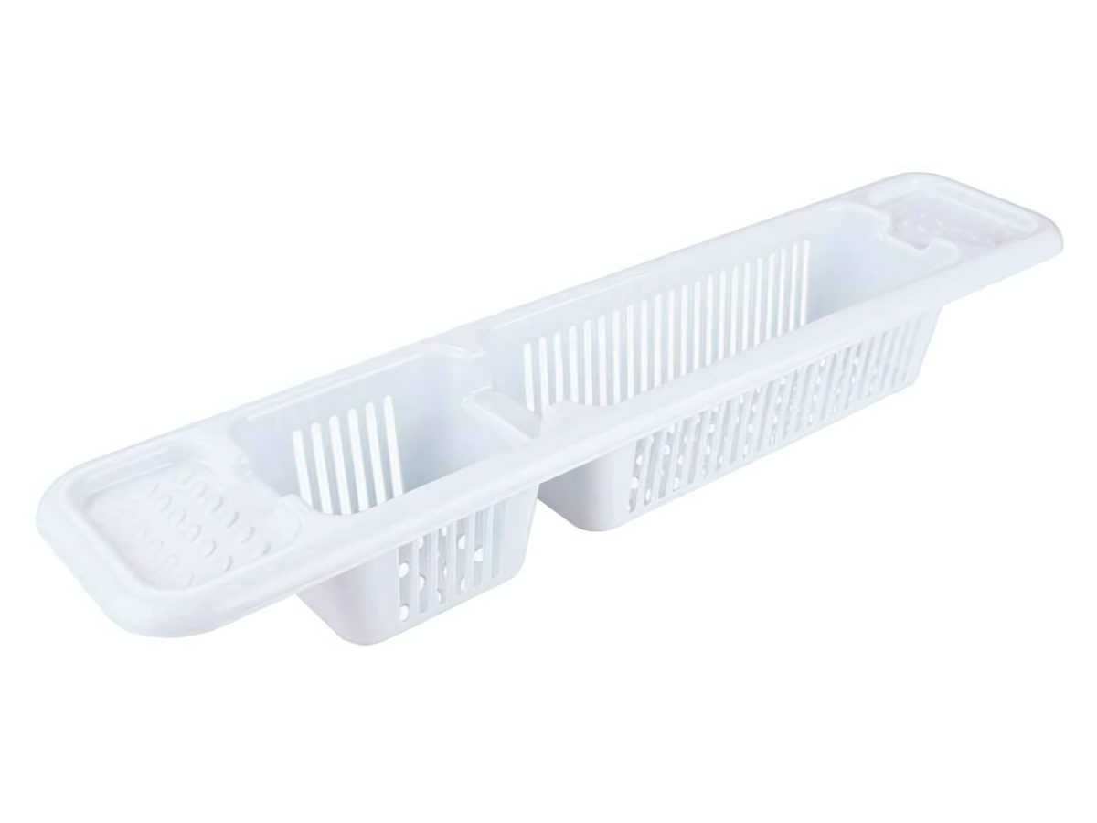 Полка имеет два отсека с отверстиями, что позволяет воде свободно стекать, предотвращая накопление влаги и обеспечивая гигиеничность. Она идеально подходит для использования в ванной комнате, а также может быть использована на кухне для хранения столовых приборов или кухонных аксессуаров. Легкий и прочный пластиковый материал делает полку долговечной и устойчивой к влаге.