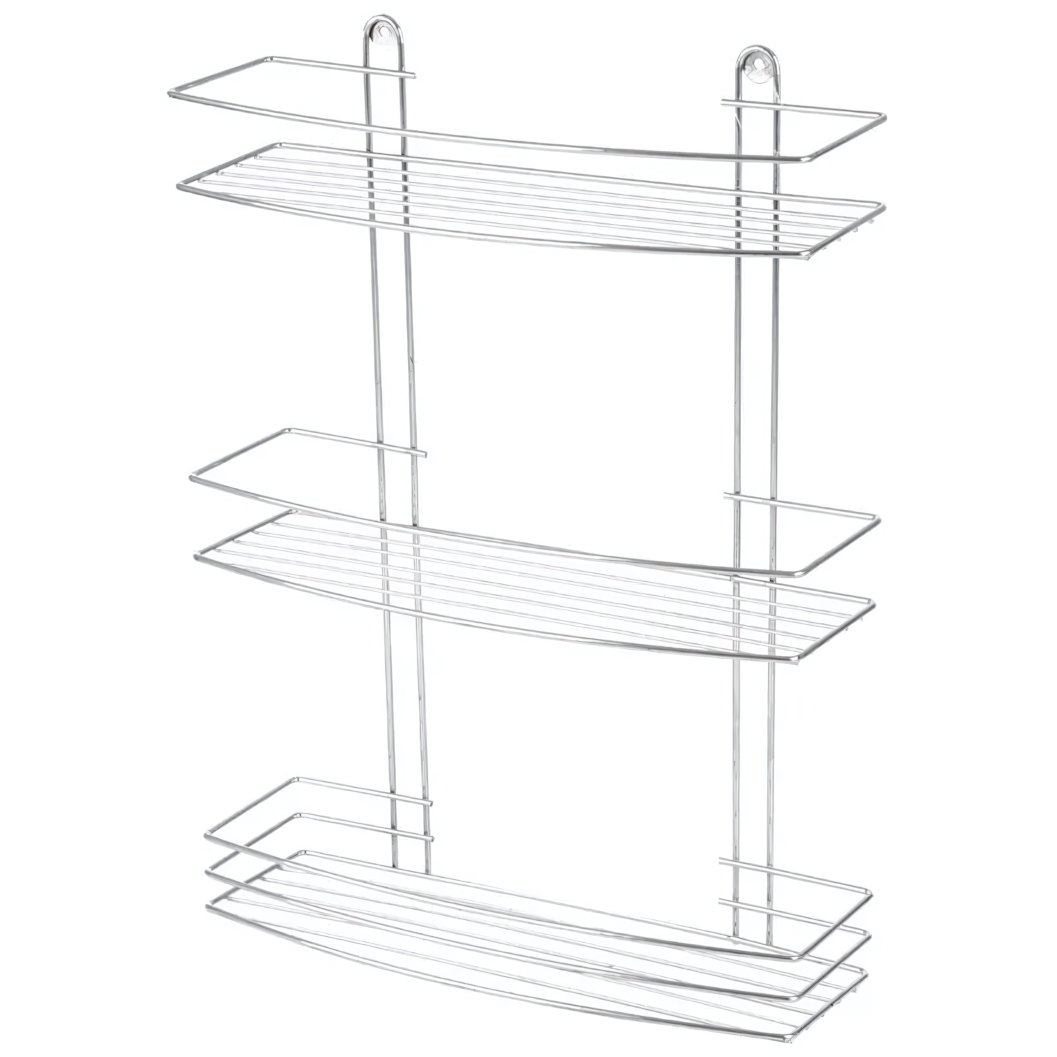Полка изготовлена из прочных металлических прутьев с покрытием под хром. Такое решение обеспечивает не только современный внешний вид, но и долговечность, устойчивость к влаге и перепадам температур, что особенно важно для кухни и ванной. Каждый из трех ярусов имеет защитные бортики по бокам и сзади, которые надежно удерживают даже небольшие предметы от падения.