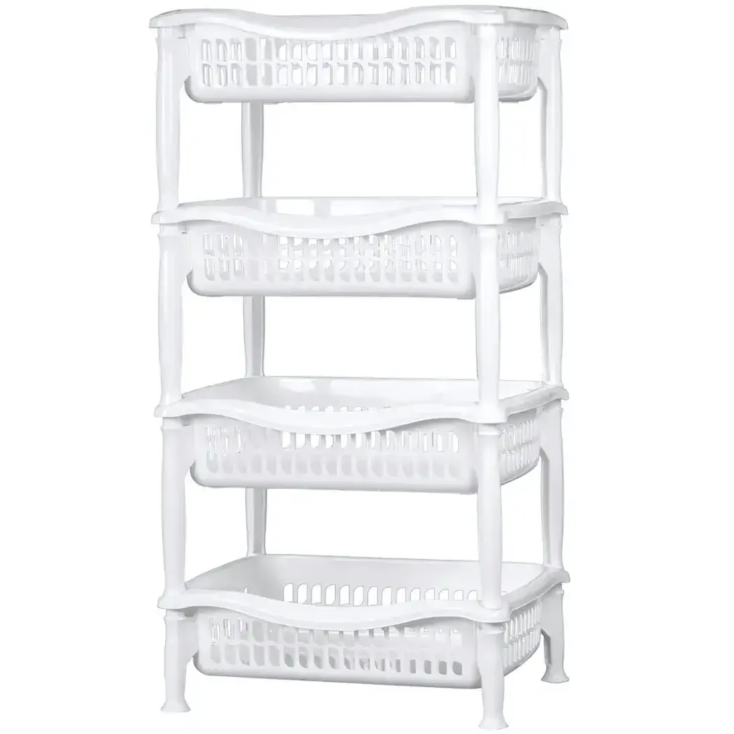 Материал: пластик. Цвет: белый. Конструкция: 4 яруса, каждый выполнен в виде решётчатой корзины без дверок и крышек, соединённых между собой прочными вертикальными опорами. Высота визуально крупная, ширина и глубина средние — оптимально для стандартных кухонь и кладовых. Идеально подходит для хранения лука, картофеля, моркови, фруктов, бытовых предметов или упаковок.