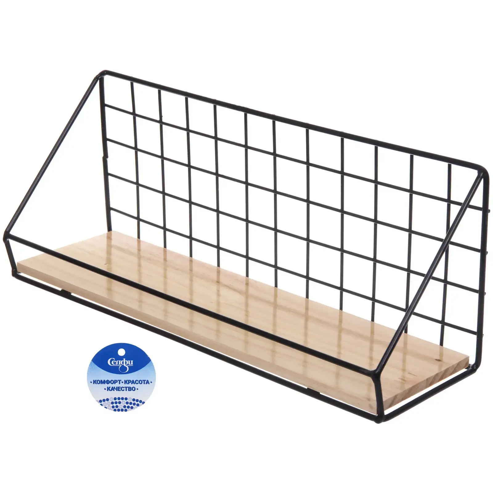 Полка выполнена из качественного дерева и прочного металла, что гарантирует долговечность и надежность. Черный металлический каркас с квадратной ячеистой решеткой обеспечивает стильный вид и прочность конструкции. Деревянная поверхность, вероятно, из бамбука, добавляет тепла и естественности в ваш интерьер.