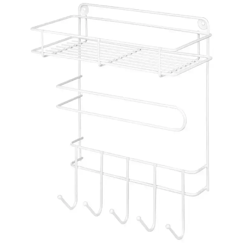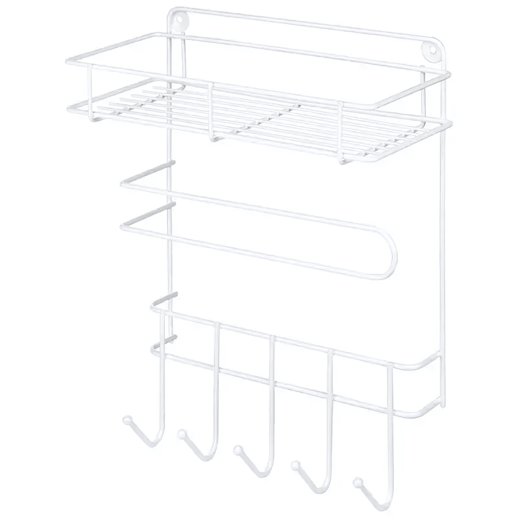Практичная металлическая полка сочетает в себе три решения для хранения: просторную поверхность для кухонной утвари, удобные крючки для аксессуаров и специальный держатель для бумажных полотенец. Идеально подходит для оптимизации пространства на кухне, в ванной или гараже.