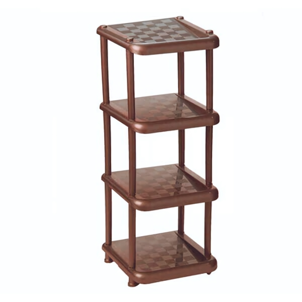 Каждая из четырёх полок выполнена в форме квадрата и объединена четырьмя вертикальными стойками. Коричневый цвет универсален и не маркируется при ежедневном использовании. Полка подходит для хранения обуви, сумок и прочих домашних мелочей, помогая поддерживать порядок без сложной организации пространства.