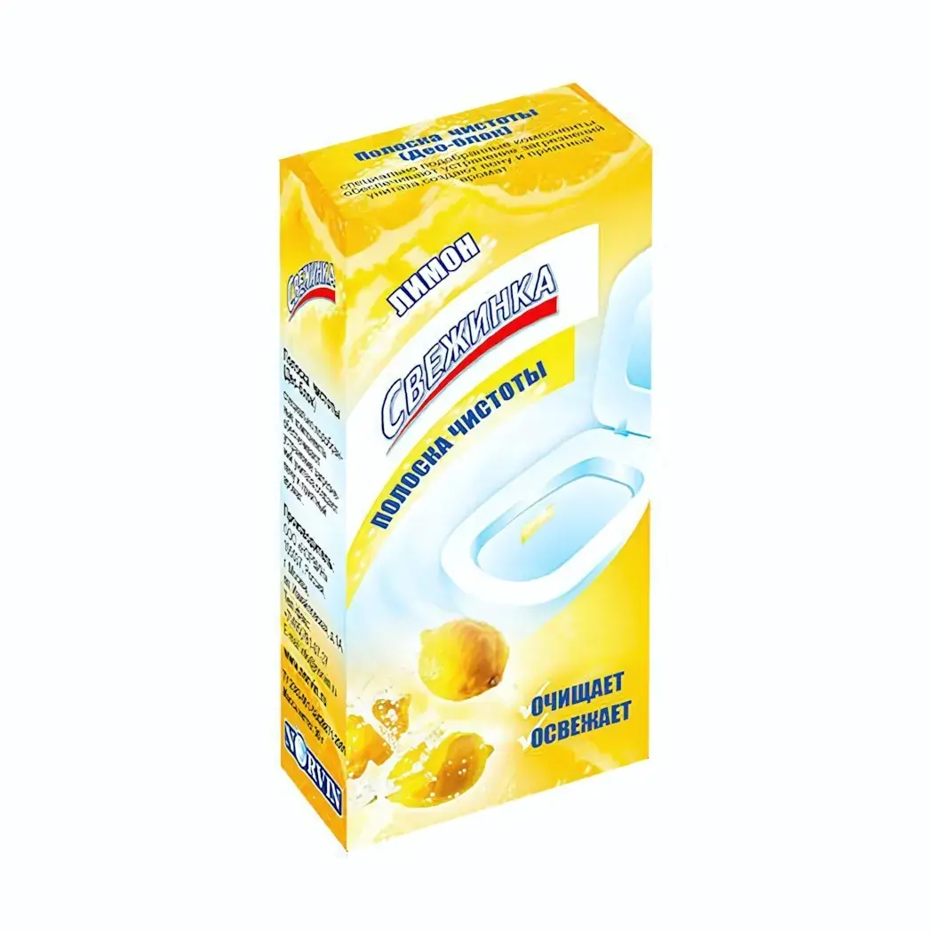 Полоска чистоты 'Свежинка' — это идеальное решение для поддержания чистоты и свежести в вашем туалете. С помощью этого продукта вы сможете легко и быстро освежить пространство, придавая ему приятный лимонный аромат. Уникальная формула очищает и устраняет неприятные запахи, обеспечивая долговременный эффект чистоты.