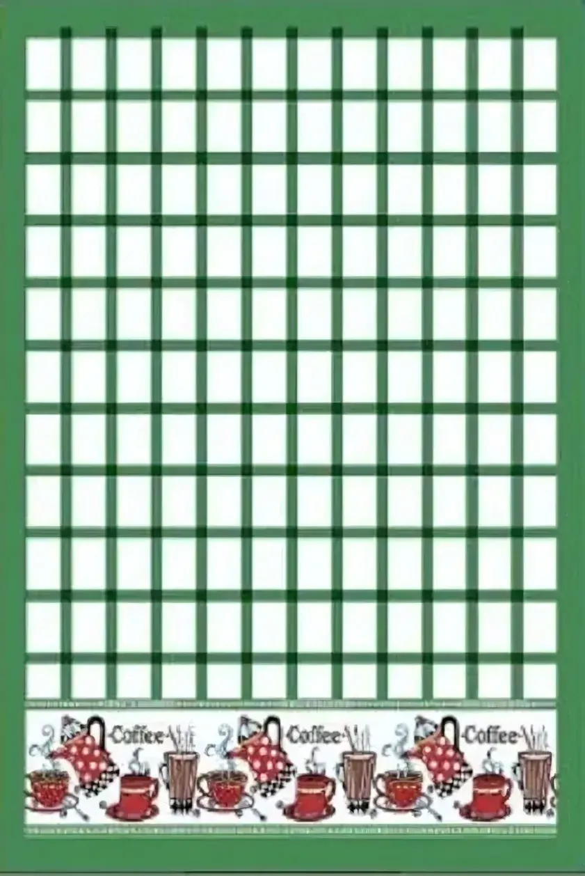 Стилизация под блокнотную клетку с декоративными элементами в виде кофейных чашек создает уютную атмосферу. Контрастная зеленая сетка гармонично сочетается с кухонным интерьером, а кофейный принт добавляет нотку тепла.