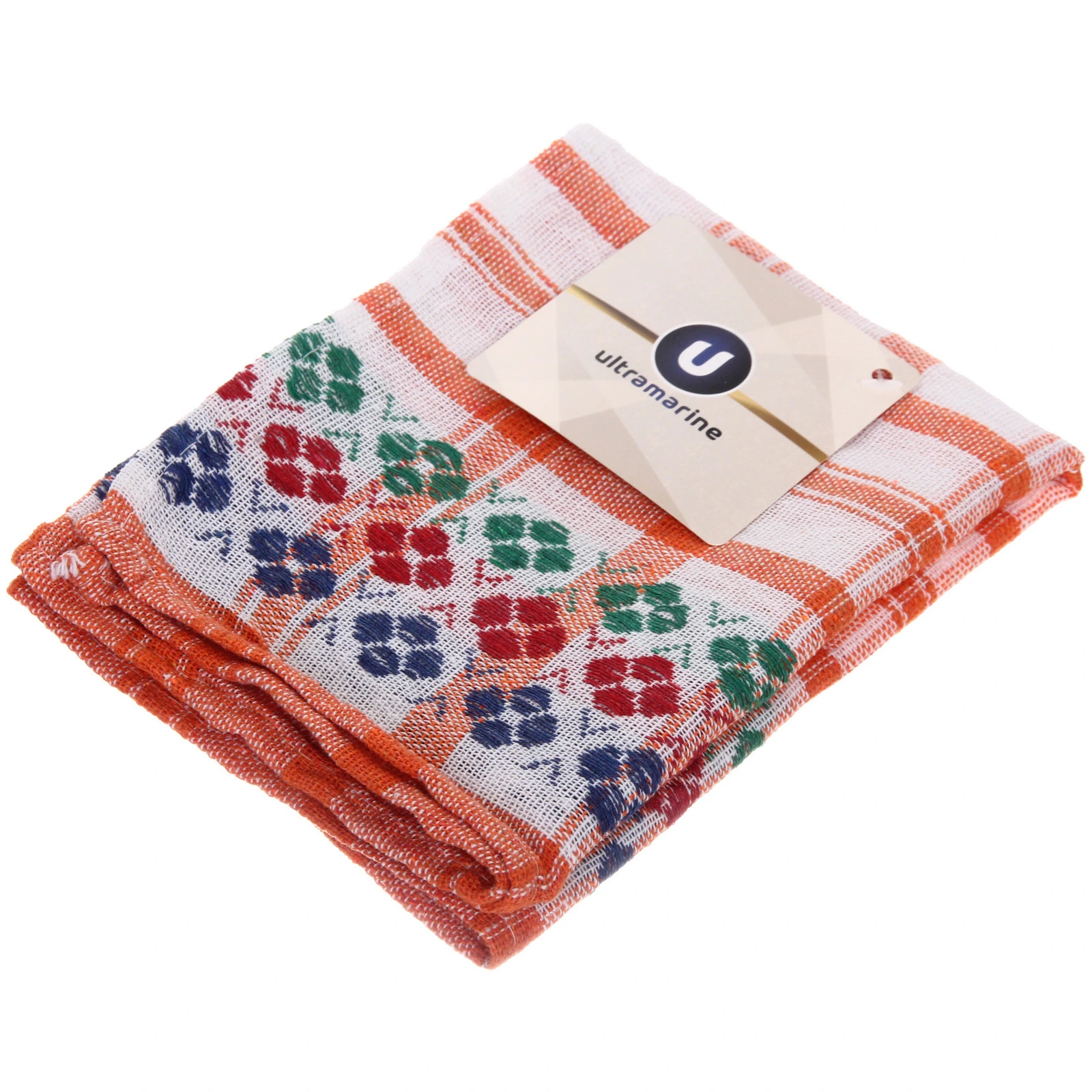 Полотенце представлено в ассортименте насыщенных цветов: красный, зелёный, оранжевый и тёмно-синий. Клетчатый узор выполнен в одном из этих цветов на белом фоне, а цветочный бордюр сочетает в себе все оттенки палитры. Отгрузка осуществляется в одном из доступных цветов, который определяется случайным образом. Это отличная возможность добавить в интерьер сочный акцент или собрать гармоничный набор из нескольких полотенец разного цвета.