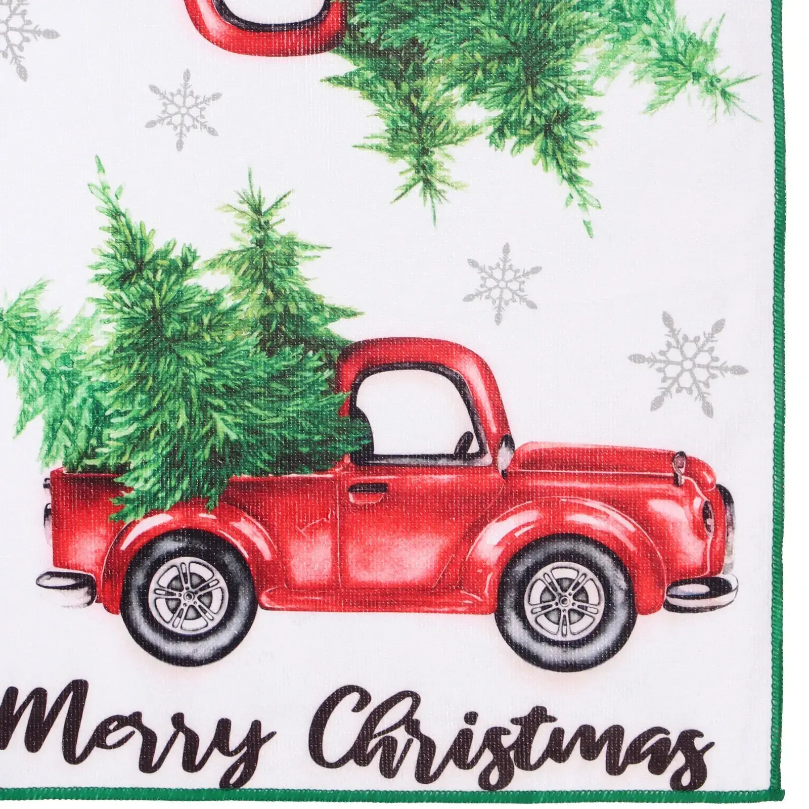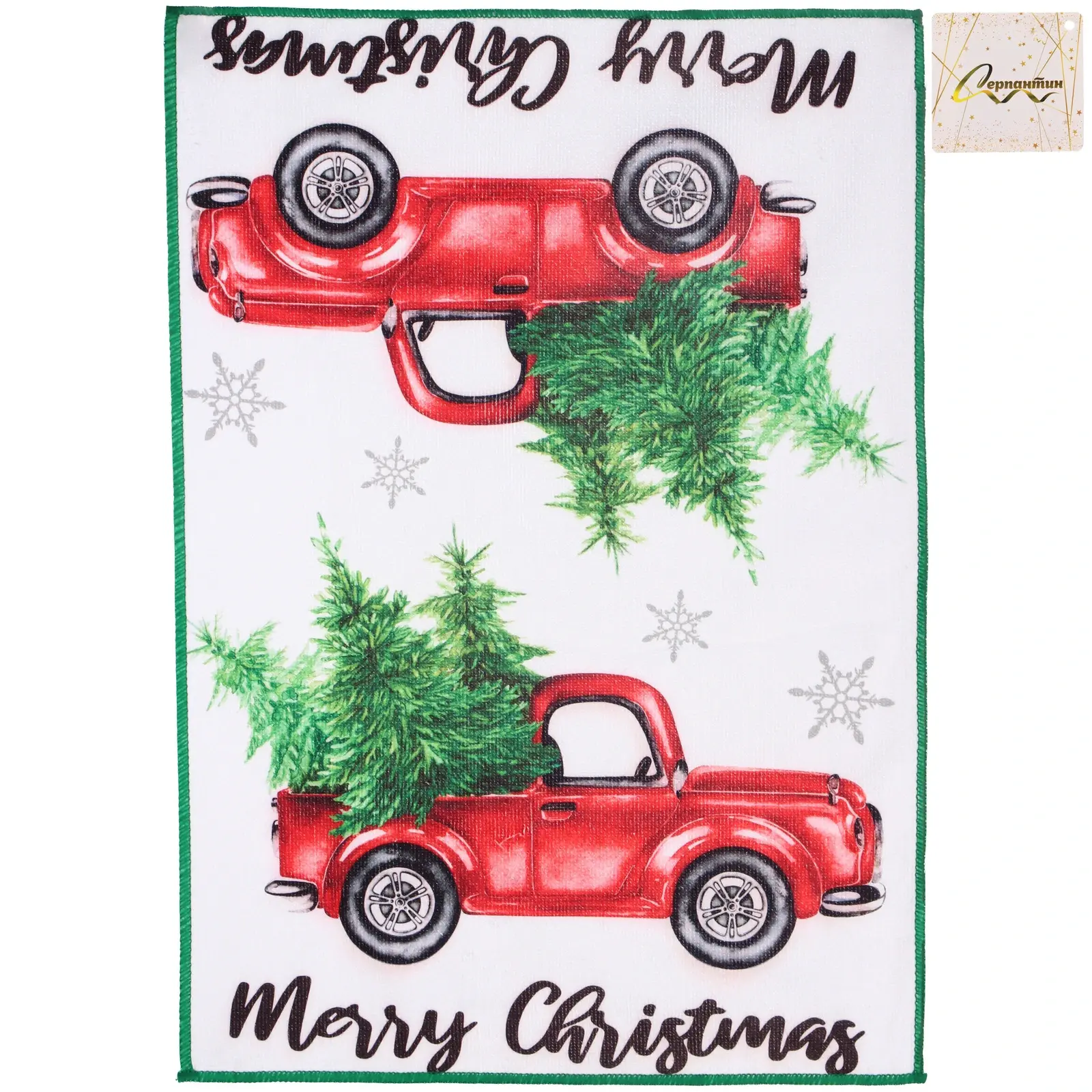 Материал: 100 % полиэстер, плотность 210 г/м². Размер: 40 × 58 см. Цвет: красный с зелёной окантовкой и снежными узорами.