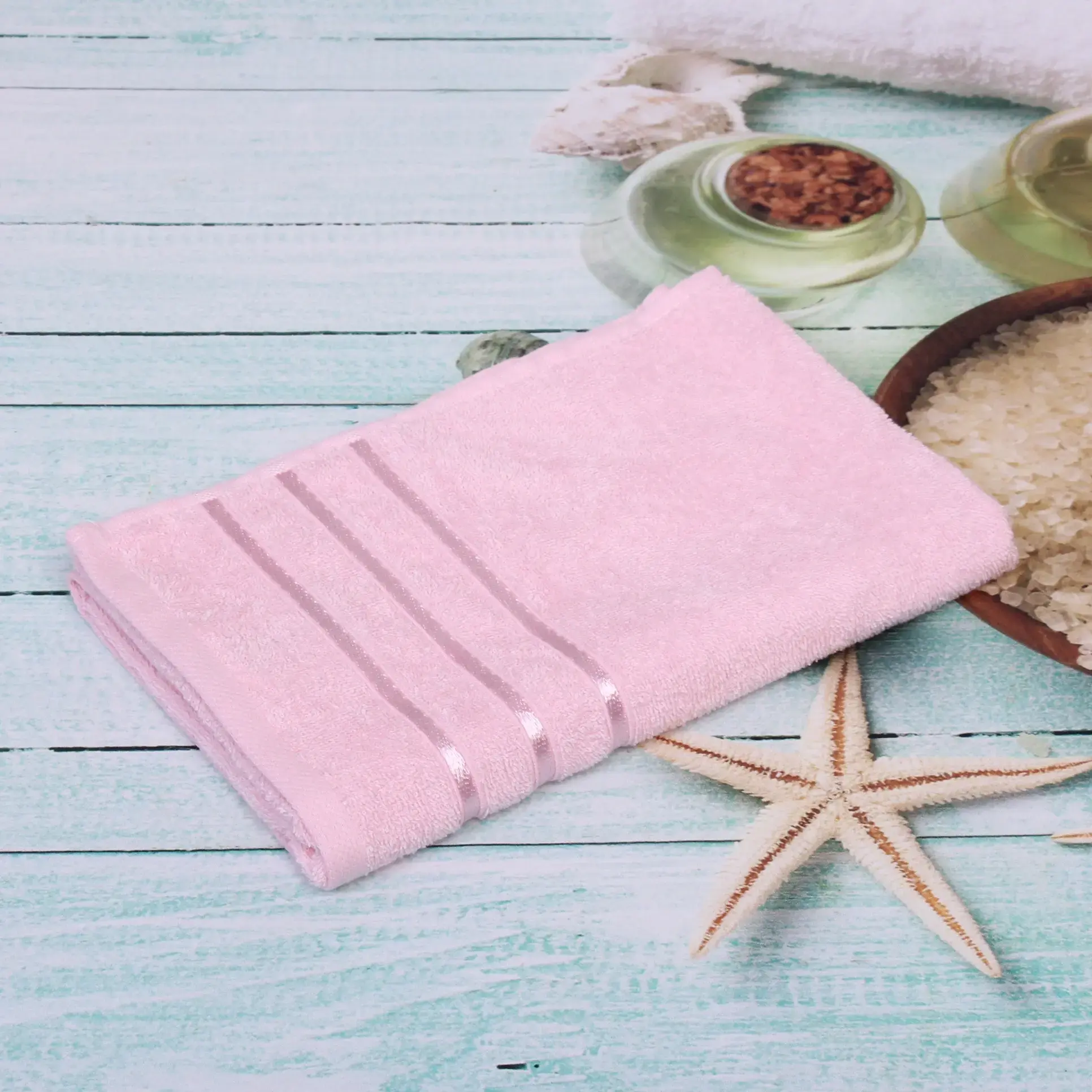 Размер 50x90 см оптимален для комфортного использования. Классический дизайн со строгими декоративными полосками гармонично впишется в любой интерьер. Светло-розовый оттенок создает атмосферу уюта, а простроченные края гарантируют сохранение формы даже при активной эксплуатации.