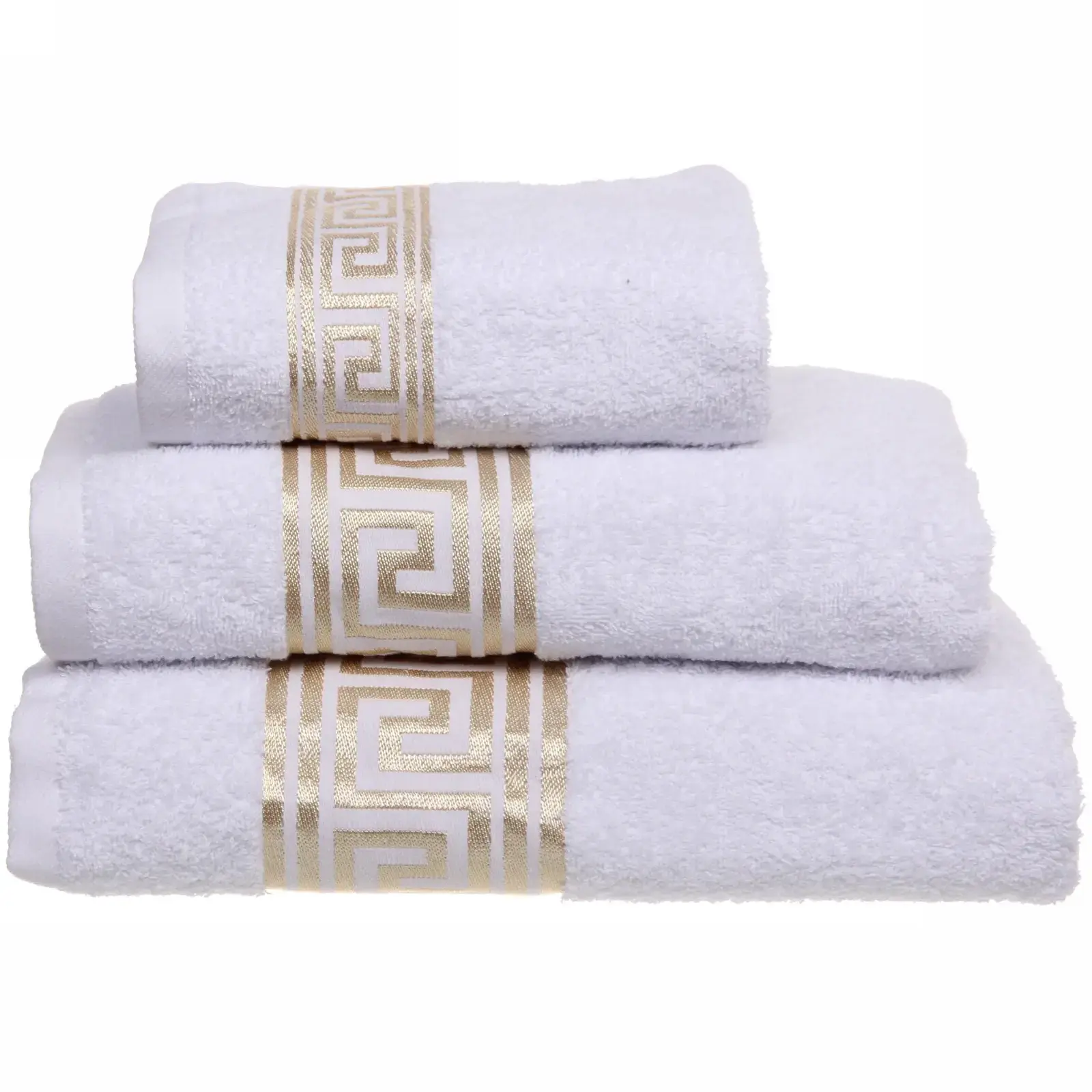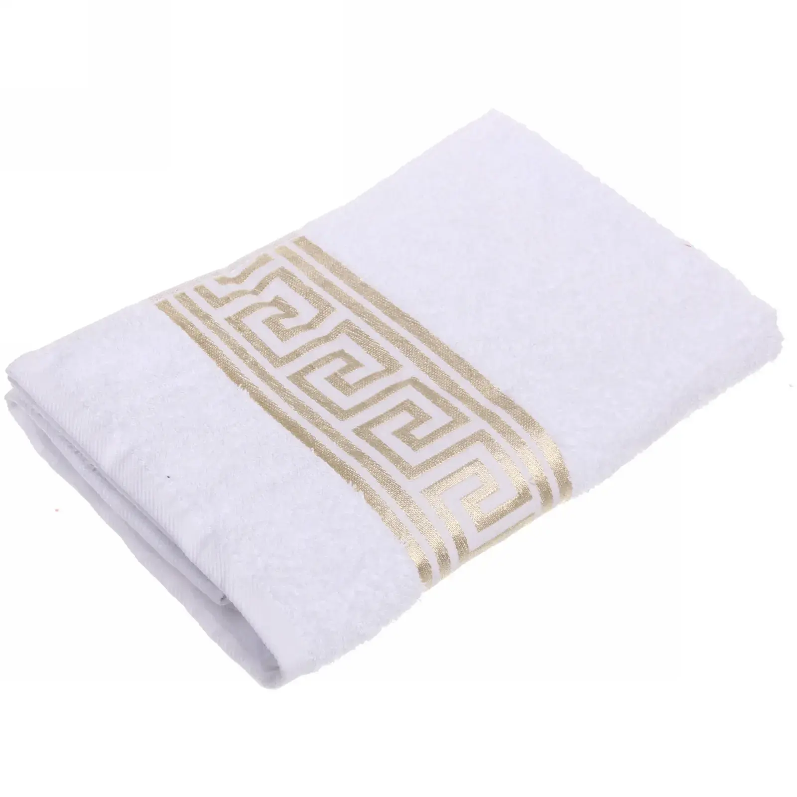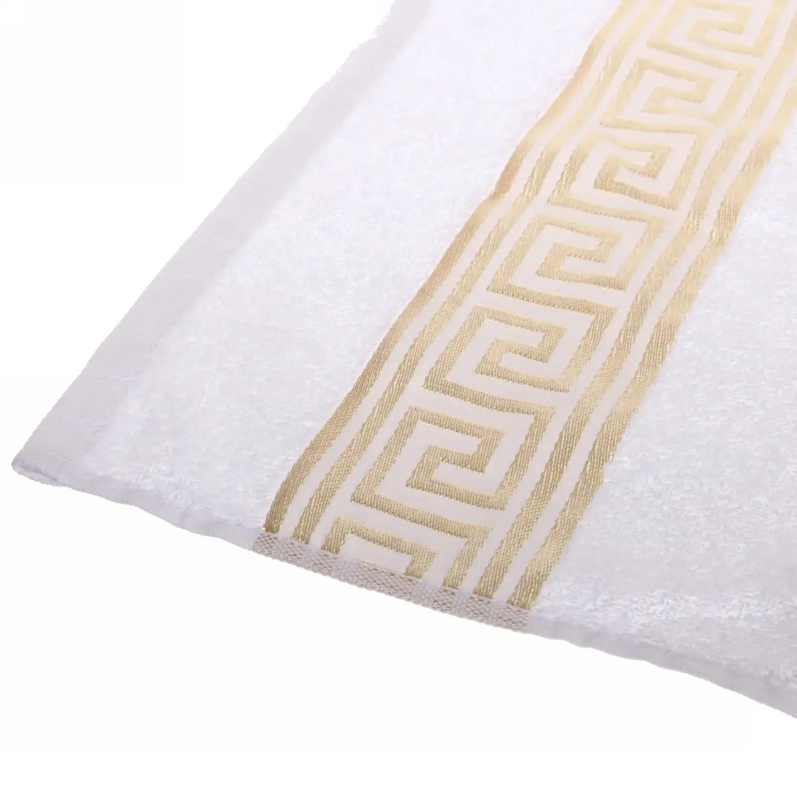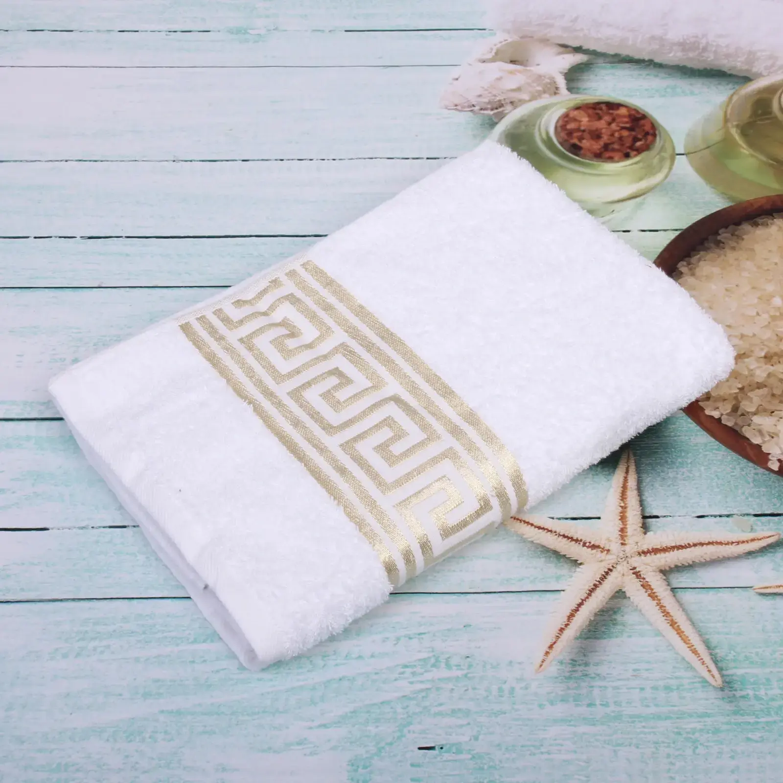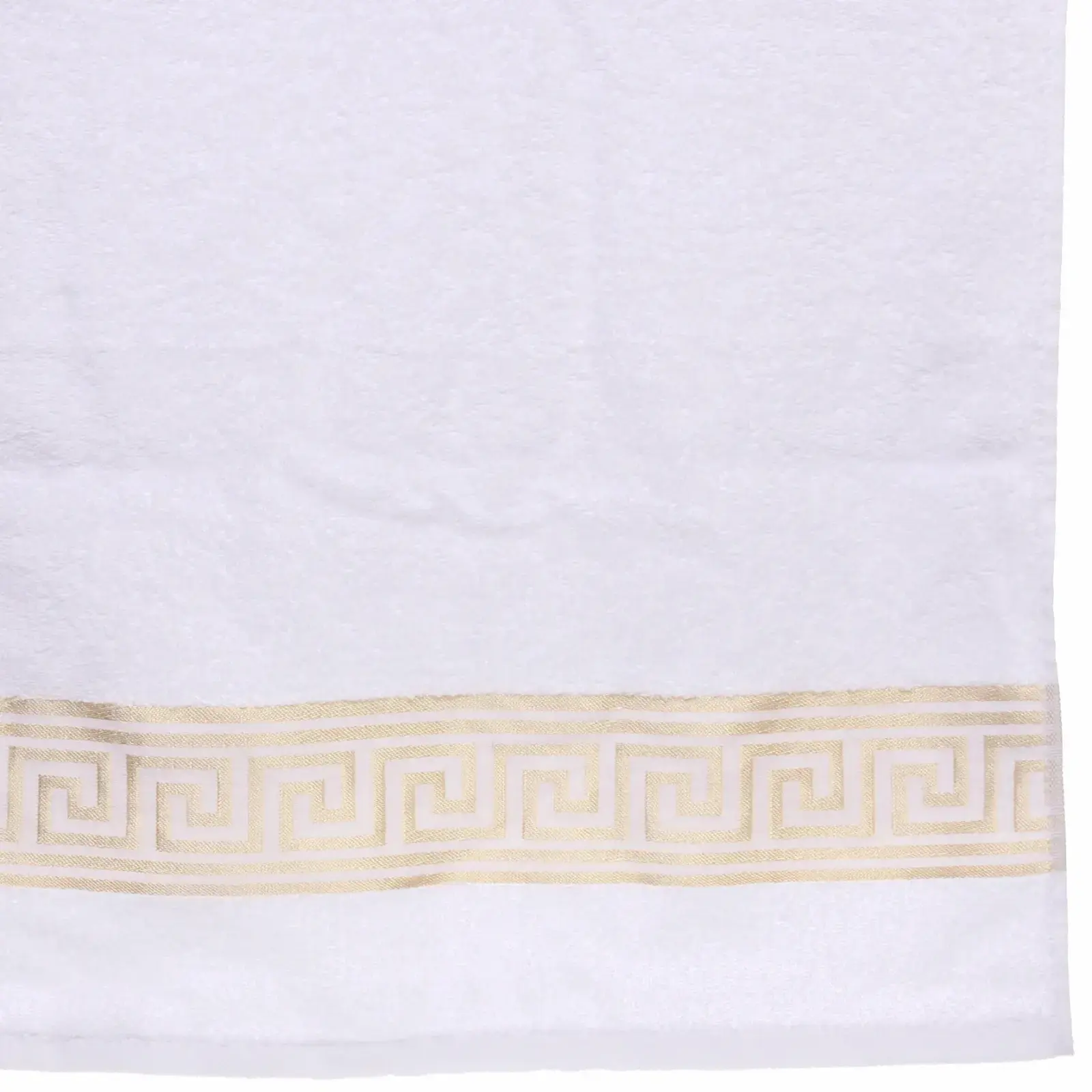 Погрузитесь в атмосферу роскоши с махровым полотенцем, сочетающим практичность и эстетику античного стиля. Золотистый меандровый орнамент добавит изысканности интерьеру ванной, а петля-подвес обеспечит удобное хранение.