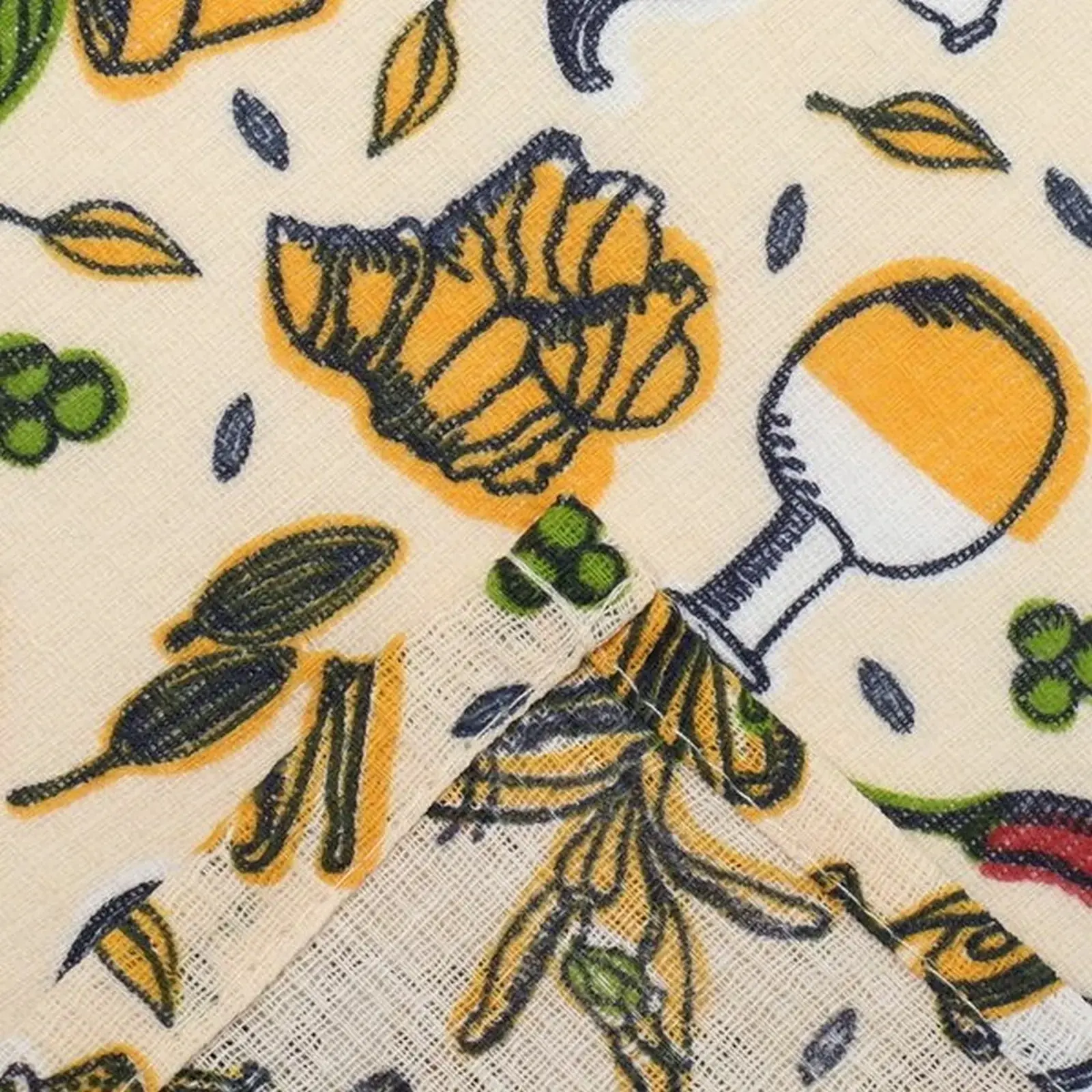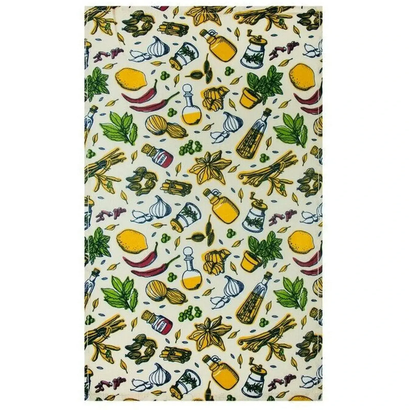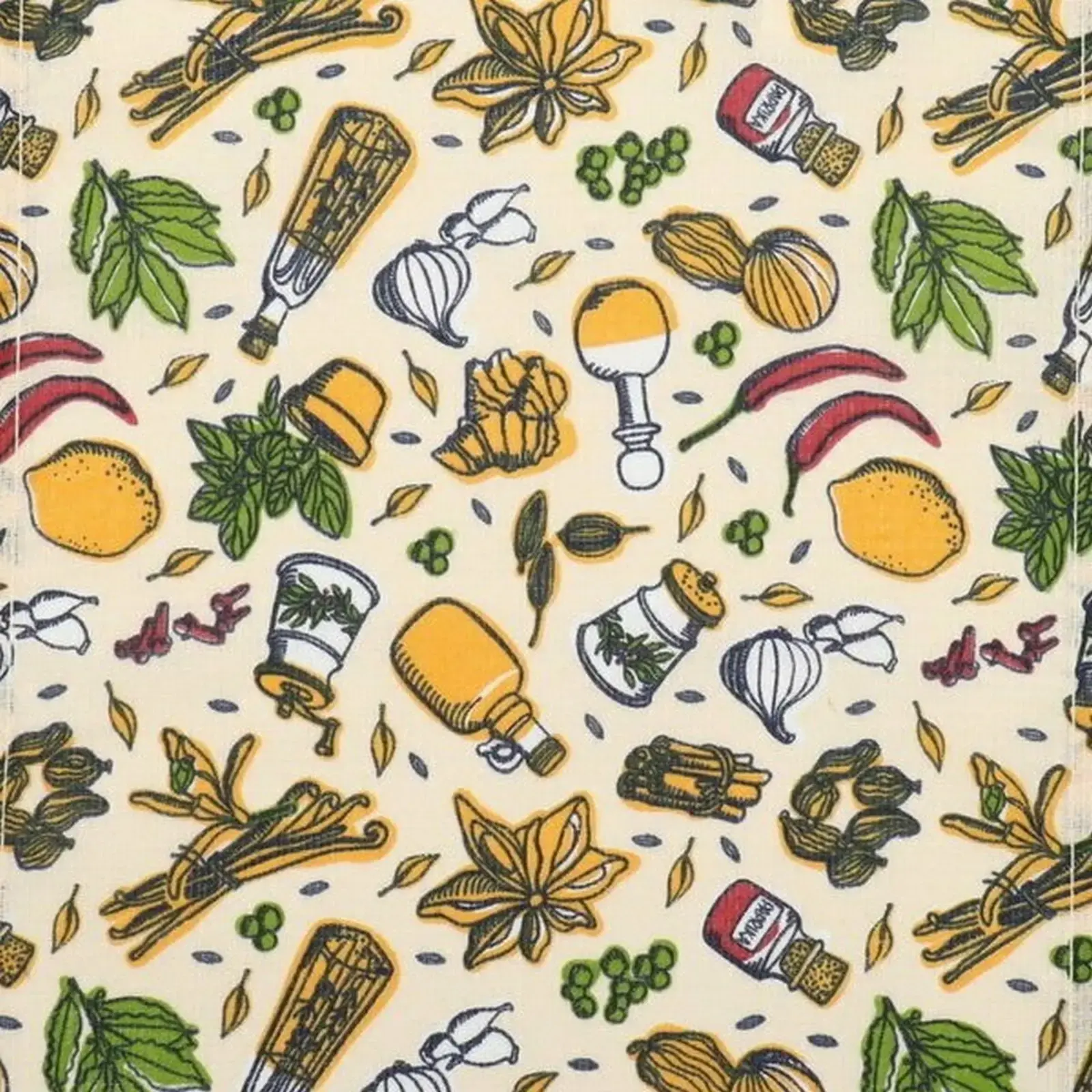 Стилизованные изображения лимонов, перца, трав и бутылочек с маслами создают динамичный рисунок. Принт нанесён экологичными красками, которые не теряют насыщенность со временем. Светлый фон с цветными акцентами легко вписывается в любую кухонную палитру.