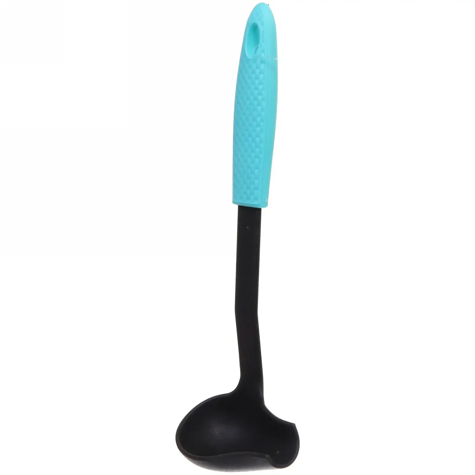 Половник выполнен из термостойкого пластика, что делает его безопасным для использования при высоких температурах. Его длина стандартная для кухонных инструментов, что обеспечивает удобство в использовании. Цветовая гамма — черный с голубой ручкой, что делает его стильным дополнением к любой кухне.