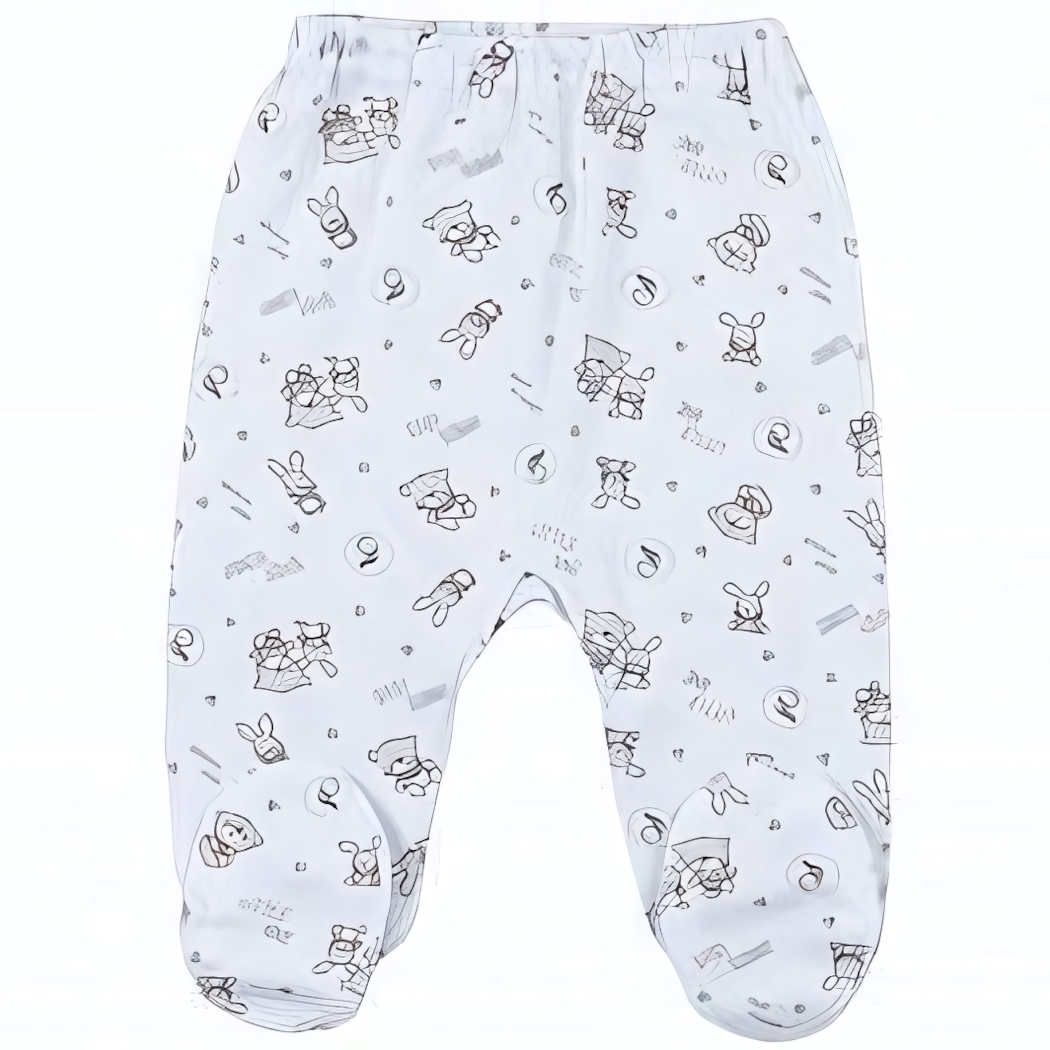 Ползунки выполнены в универсальном серо-белом цвете с графичными силуэтами медвежат и зайчат. Плотная ткань сохраняет форму после многократных стирок, а плоские швы предотвращают натирание. Подходят для ежедневного использования дома, на прогулках или в детском саду.