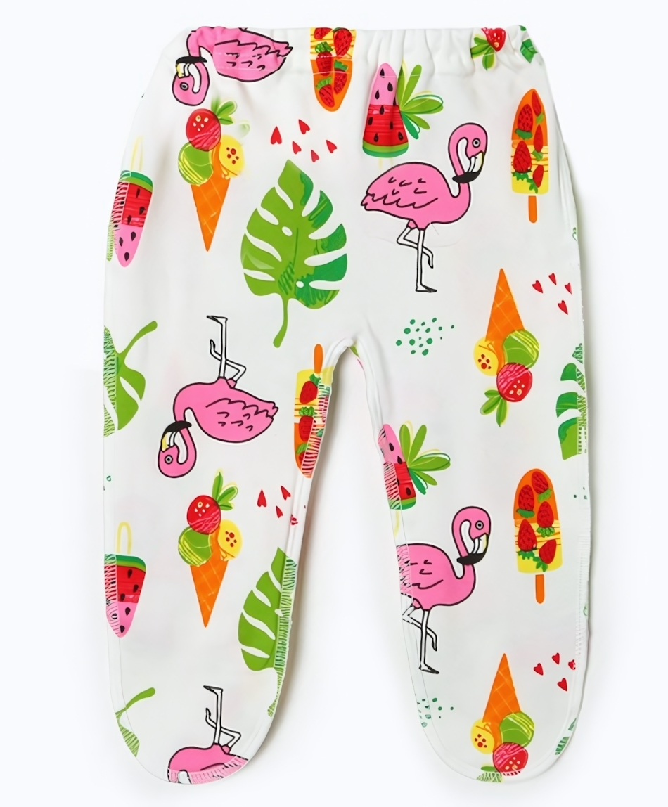 - Яркий дизайн: Привлекательный принт с фламинго и фруктами делает эти ползунки стильными и забавными.