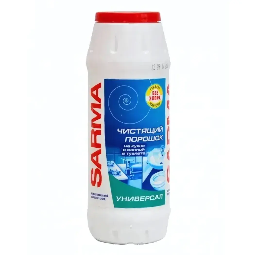 Универсальный чистящий порошок 'Sarma' — ваш надежный помощник в борьбе с загрязнениями на кухне, в ванной и туалете. Благодаря специальной формуле без содержания хлора, он безопасен для поверхностей и здоровья вашей семьи.