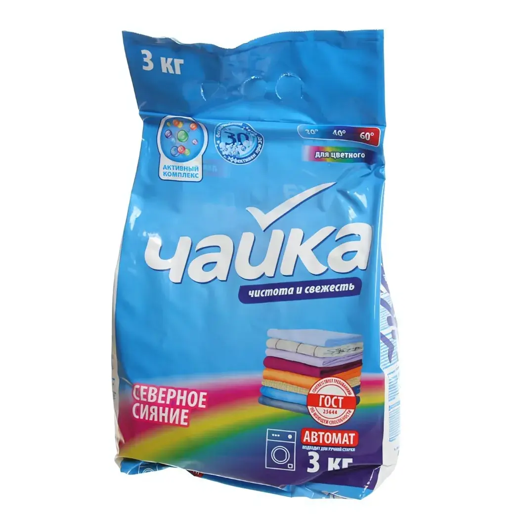 Упаковка порошка весит 3 кг и выполнена в ярком синем цвете, что делает его заметным на полке. На упаковке указаны температурные режимы стирки: 20°, 40° и 60°, а также информация о том, что продукт соответствует стандартам ГОСТ. Порошок Чайка — это ваш надежный помощник в поддержании чистоты и свежести вашего белья.
