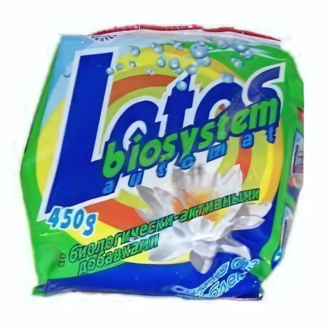 Упаковка порошка весит 450 граммов и выполнена в ярком дизайне, который привлекает внимание. На упаковке изображены пузырьки и цветок лотоса, что подчеркивает свежесть и натуральность продукта. Используйте порошок 'Lotos Biosistem' для достижения идеальных результатов стирки и наслаждайтесь чистотой ваших вещей!