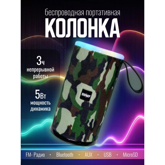Портативная колонка BENEF BF-227 — это идеальный выбор для тех, кто ценит мощный звук и стильный дизайн. С камуфляжным цветом, она станет отличным спутником на пикниках, вечеринках и в путешествиях. Благодаря беспроводной технологии Bluetooth, вы сможете наслаждаться любимой музыкой без лишних проводов, а светодиодная подсветка добавит атмосферу в любое мероприятие.