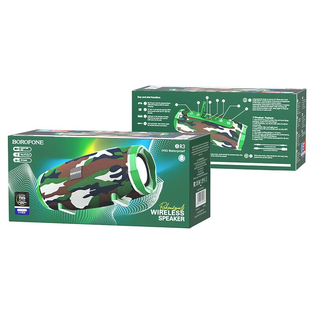 Колонка портативная "BR3" с водонепроницаемостью IPX5, 10W, 1200mAh, 3 часа работы, зеленый камуфляж